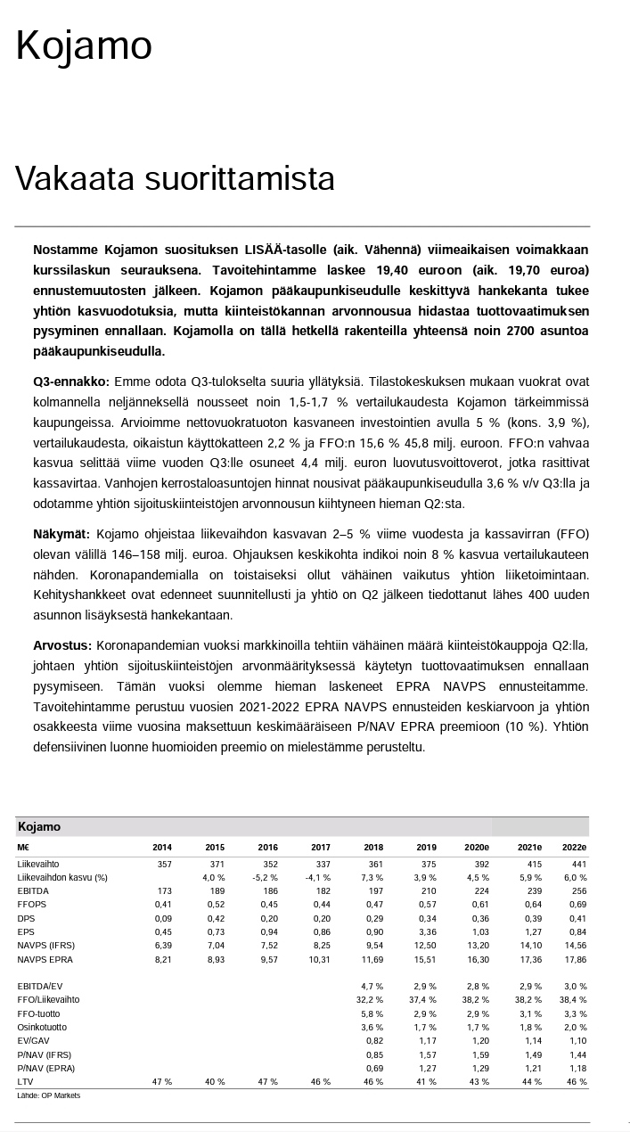 Itse veikkaan, että kyseessä on vain se, että Kojamo nähtiin keväällä ja alkukesästä koronan turvasatamana. Sama trendi on ollut näillä muillakin “bondi” osakkeilla eli Elisalla ja Koneella.