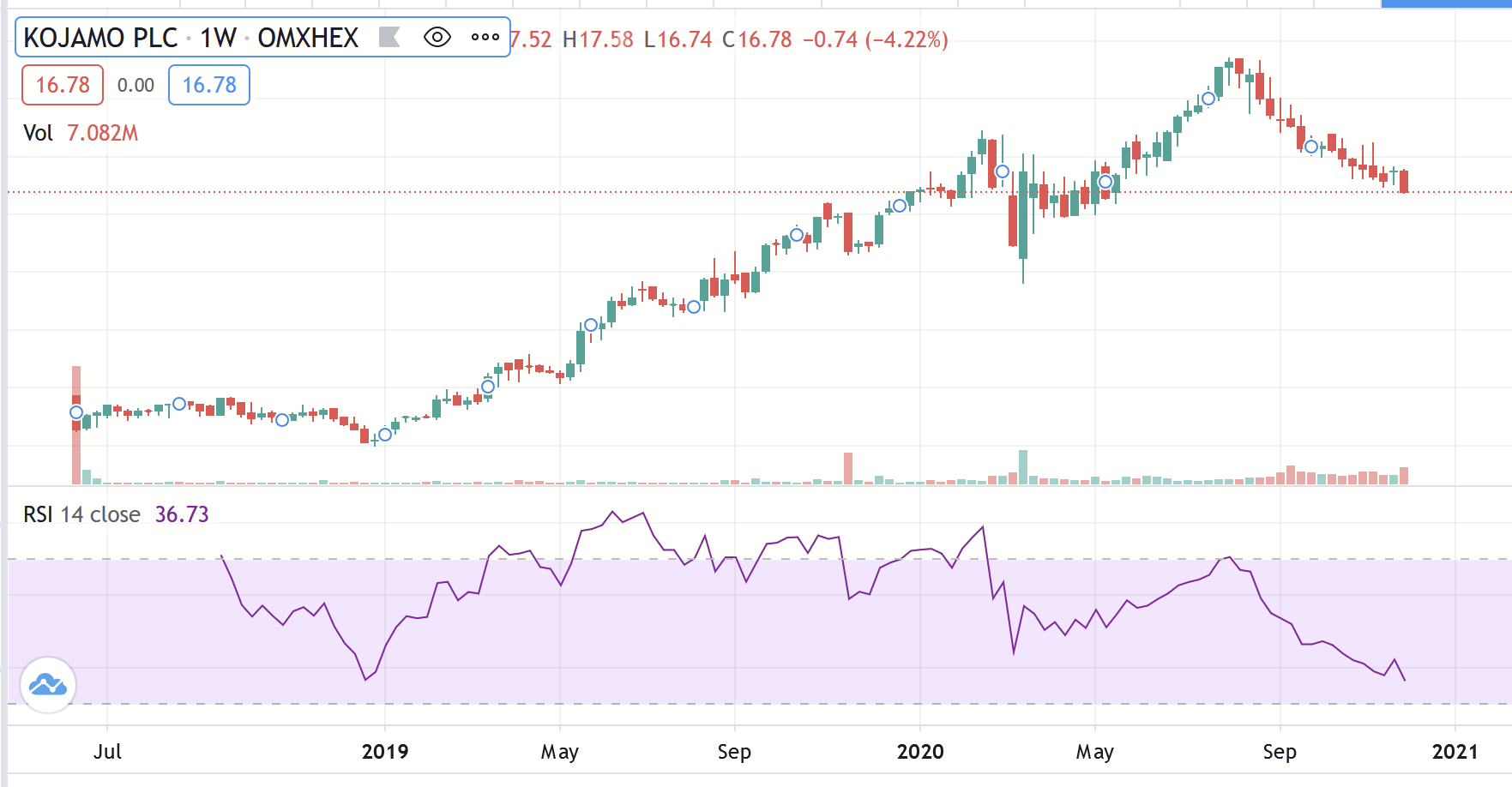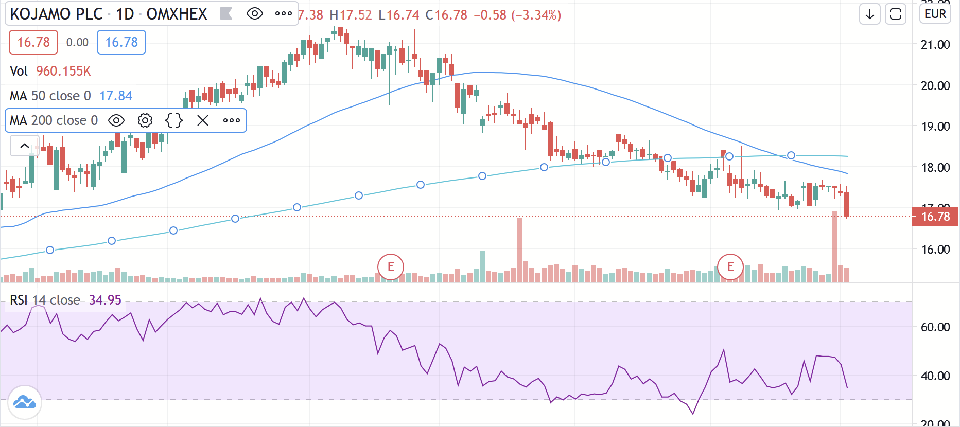 Det ville være interessant at vide, hvad der trækker Kojamo ned. Er det kun fordi den har været faldende i lang tid, så den teknisk set bare tilfældigvis er i en nedadgående trend, og derfor falder den?