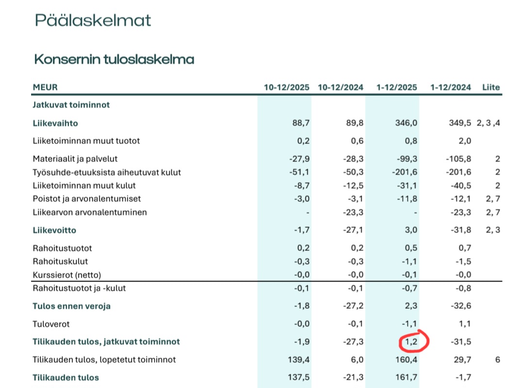 Luotean kurssi nousi aika paljon irtautumisen jälkeen. Itse epäilin ettei kaikki ostajat tienneet mitä ostivat. Monet ennusteet näytti mitä tahansa ja sen takia varmasti moni teki vääriä johtopäätöksiä. On vuoden 2025 nettotuloksessa Inderesilläkin 30,7M€ ja lopulta päädyttiin lukemaan 1,2M€. Siinä saattoi jollain mennä kahvi väärään kurkkuun ja sormi siirtyi myyntinapille. Itse näin uudessa Lassila & Tikanojassa enemmän arvoa ja ostin näistä kahdesta sitä. Mielenkiinnolla seuraan millainen tästä vuodesta tulee Luotealle itsenäisenä yhtiönä.