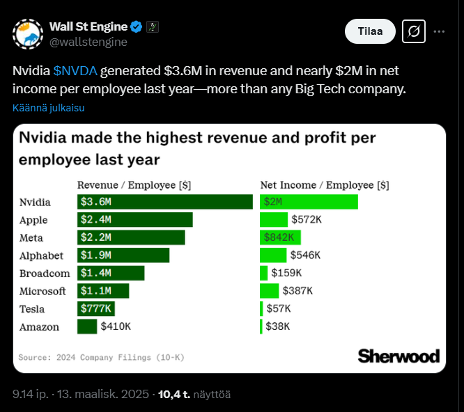 Here’s a fun comparison of how giant companies generate revenue and profit per employee. ![]()