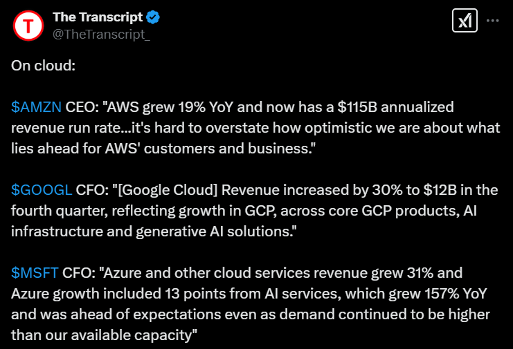 This tweet highlights comments from Amazon, Alphabet, and Microsoft leadership on cloud business, along with some graphs on the same theme. ![]()
