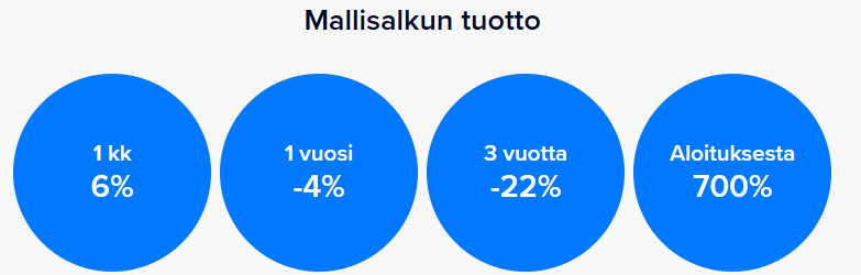 Mallisalkun vuotuinen kasvukerroin CAGR oli 1.5.2011 - 1.5.2024 eli 13 vuoden ajalta 17,35% ( 1+ 700%)^(1/13)-1. Samaa aikaan vertailuindeksin OMXH CAP GI kasvukerroin oli “vain” 11,10%.