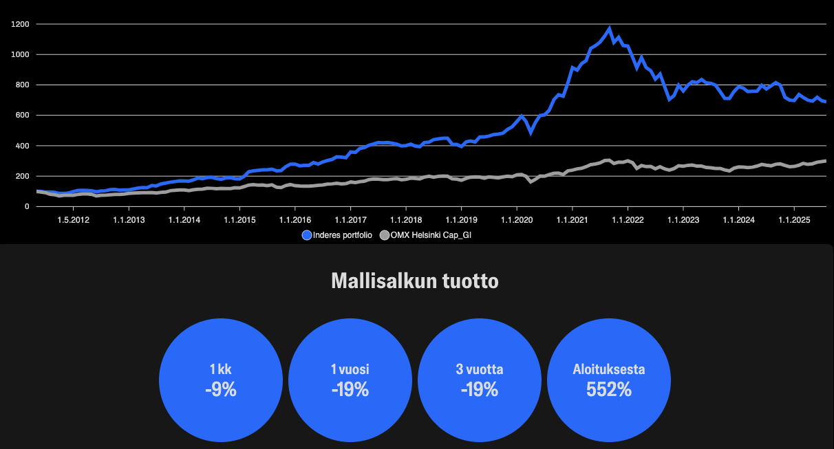 Tämä varmasti näyttää hyvin erilaiselta ulkopuolelta kuin sisältäpäin katsottuna. Mallisalkkuhan on ihan objektiivisestikin eri strategialla vuonna 2025 liikenteessä kuin vuonna 2011 ja evoluutio sijoittamisessa on tietysti luonnollista, kun myös Mallisalkkutiimi ja Inderes on kehittynyt ja muuttunut. Räikeimpänä esimerkkinä on ulkomaisten ja seurannan ulkopuolella olevien osakkeiden ostaminen Mallisalkkuun, mistä perustellusti ajan myötä luovuttiin kokonaan. Myös pitkäaikaisena Mallisalkun seuraajana teidän viestintätapa Mallisalkun sijoituskriteereistä on kyllä mielestäni muuttunut rajusti esimerkiksi tuossa vuosikymmenen vaihteen jälkeen, kun tuli tuo poikkeuksellisen iso nousuputki: