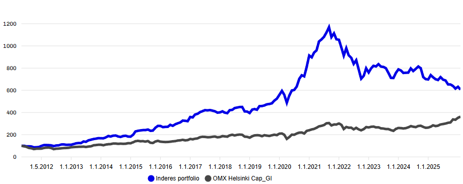 Since January 2016, Inderes’s portfolio has risen from 279 → 607, i.e. approx. 117%.