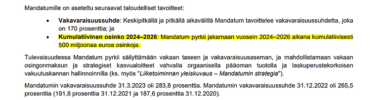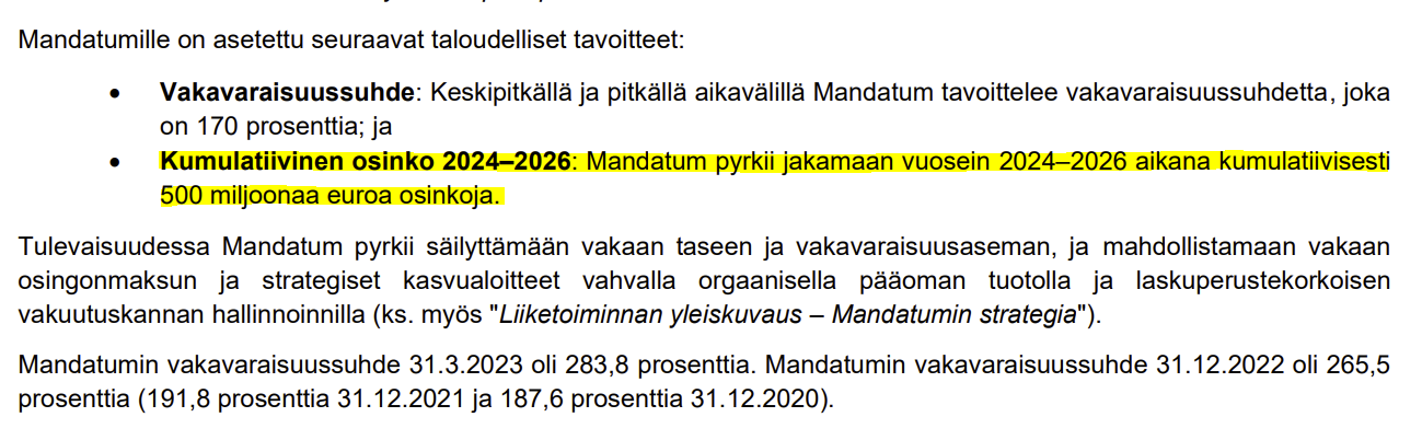 As I understand it, Mandatum will have a 1:1 share count with Sampo, i.e. approx. 555 million shares. Doing some quick math based on what Mirko pointed out, that would result in €166M in dividends per year, or approx. €0.30/share/year.