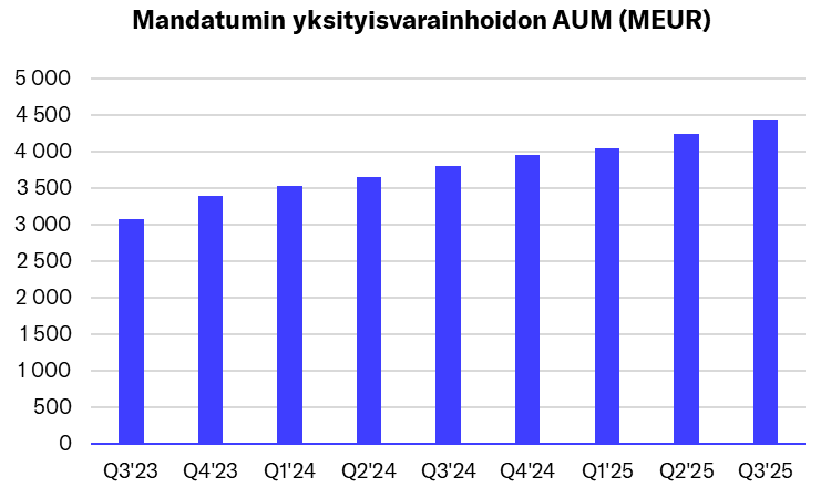 Although the sample size is quite limited (503 individuals) and thus does not precisely represent the entire market, the top position is nevertheless a strong indication of customer satisfaction. This is, of course, no surprise, as the company has ranked among the top positions before (second place after Ålandsbanken in 2023 and 2024). At the same time, the assets under management in this segment have developed very strongly (+44% Q3’23–Q3’25):