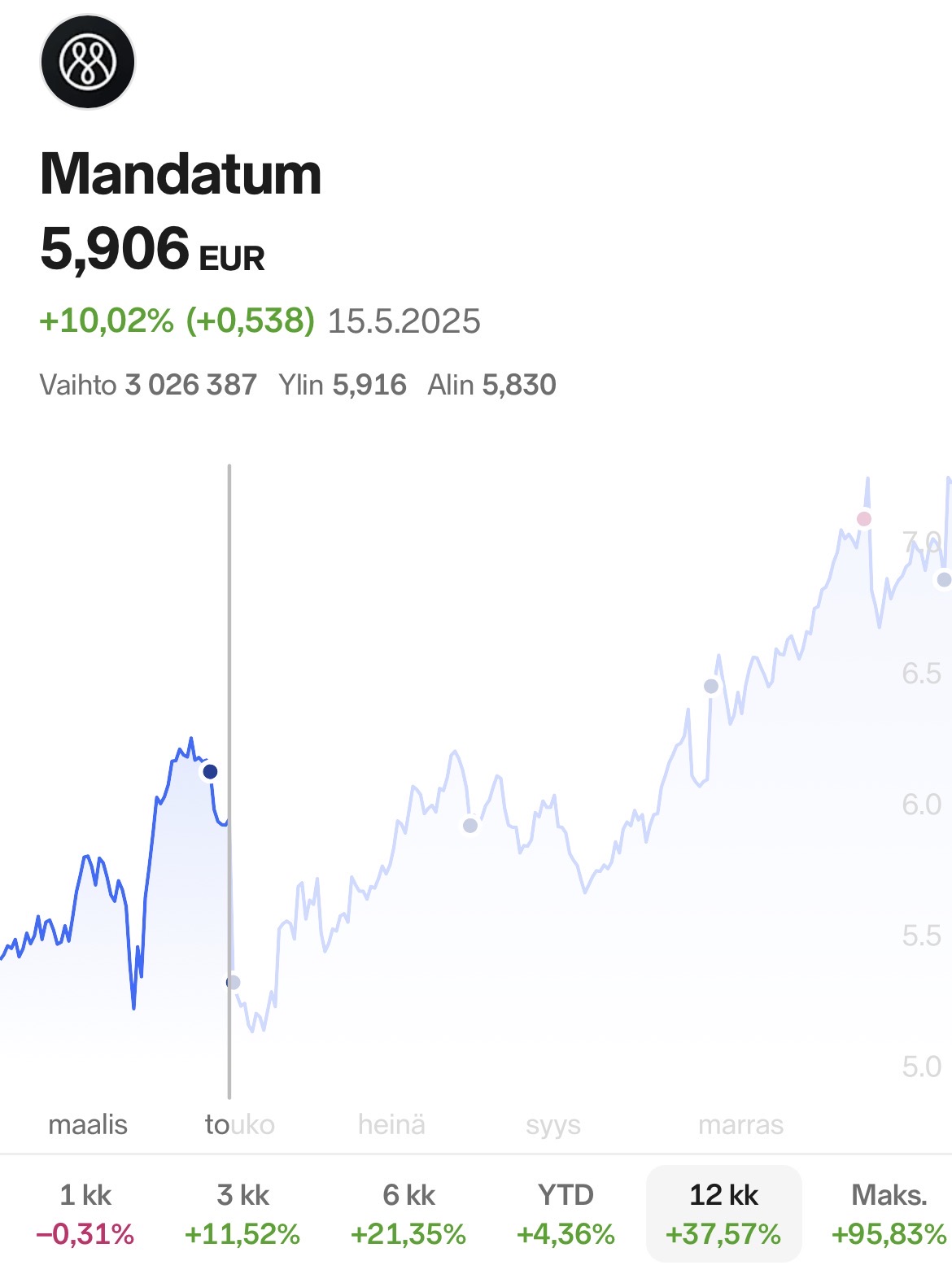 Solidium isona omistajan myi, en tiedä kannattiko? Jokainen haluaa vain ison tilin välistä. Piensijoittajana pitää tyytyä alle miljoonien voittoihin Myy kun muut ostaa, osta kun muut myy. Toiminut aika hyvin.