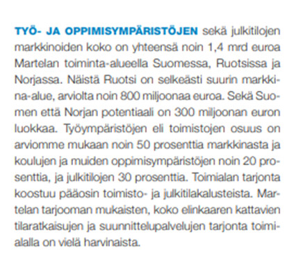 Olet avain oikeassa siinä, että yhdistynyt kokonaisuus jäisi edelleen selvästi Ikeaa pienemmäksi toimijaksi. Tällaisessa tilanteessa se tuhannen taalan kysymys on, että miten kilpailuviranomaiset määrittävät markkinaosuudet. Yritykset tilaavat varmasti myös Ikealta, mutta yhtiön fokus on kuitenkin pääasiassa kuluttajamyynnissä. Jos kuluttajamyynnin ottaa osaksi yhtiöille relevanttia kohdemarkkinaa, tuo ei varmasti aiheuttaisi ongelmia. Toisaalta, jos markkinaosuuksia katsoo työ- ja oppimisympäristöjen näkökulmasta, tarina on melko erilainen. Alla kuvakaappaus Martelan 2017 vuosikertomuksesta.