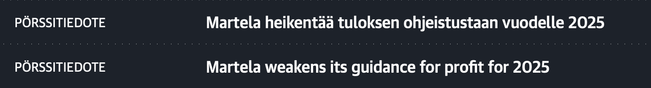 Even the Finnish headline is bleak, but the English is already utterly poor, and the sentence could even be understood to mean that Martela would lower its guidance to gain profit Just ‘Martela lowers its guidance for 2025’ would have been enough. /rant (sorry)