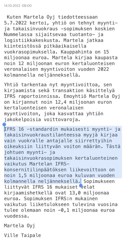 Melko selvästi yhtiön omassa tiedotteessa mainittiin että: ”Martela kirjaa kaupasta noin 12 miljoonan euron kertaluonteisen veronalaisen myyntivoiton vuoden 2022 kolmannella neljänneksellä.” , joten tuon osalta sanoisin että lähinnä esitystapa meni metsään ![]()