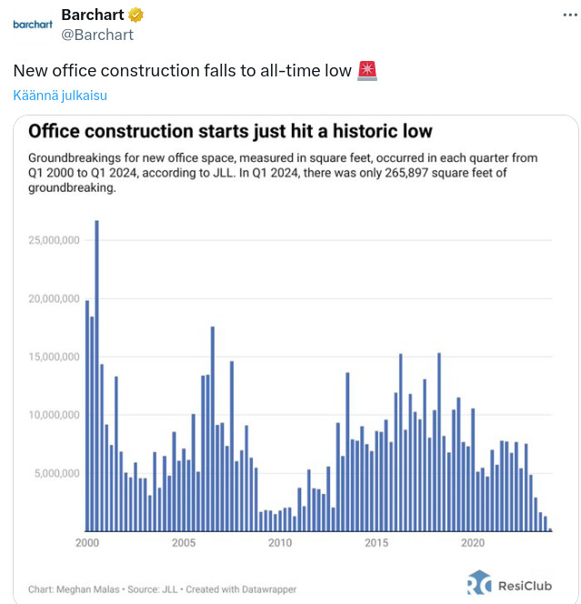 Matalaa on kysyntä toimistotiloilla. Talouskasvu on hidastunut, korot ylhäällä, mutta myös muuttuvat työskentelytavat vaikuttavat, kuten etätyön yleistyminen on osin varmaan vaikuttanut.