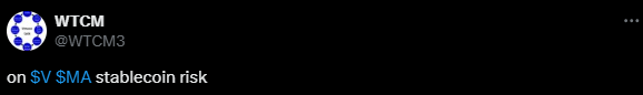 Jos alla olevasta tviitistä lukee sekä päättelee, niin Mastercardin ja Visan näkökulmasta stablecoinit eivät vielä uhkaa korttipohjaista maksuekosysteemiä merkittävästi, mutta toisaalta miksei sitten “vähän” myöhemmin".