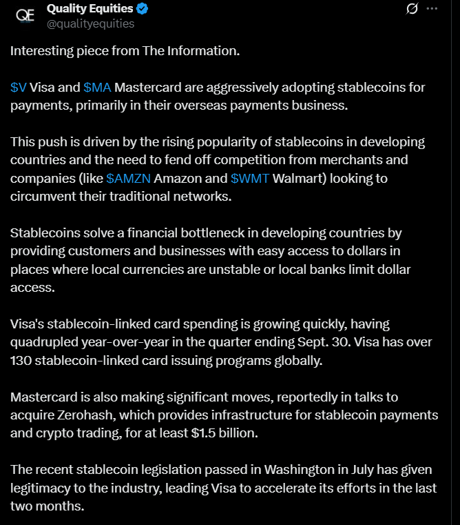 Alla olevassa tviitissä nostetaan esille, miten Visa ja Mastercard ottavat stablecoinit kovaa vauhtia käyttöön etenkin kehitysmaiden maksuissa, joissa dollarit ovat olleet kysyttyjä.