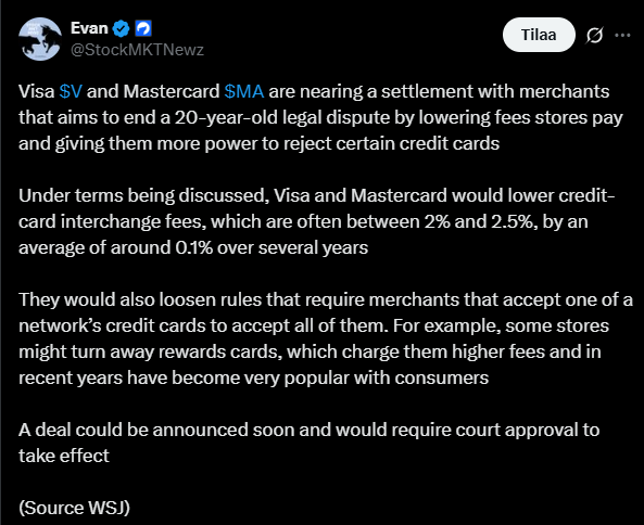 Visa ja Mastercard ovat lähellä sopua kauppiaiden kanssa vuosikymmeniä kestäneessä kiistassa.
