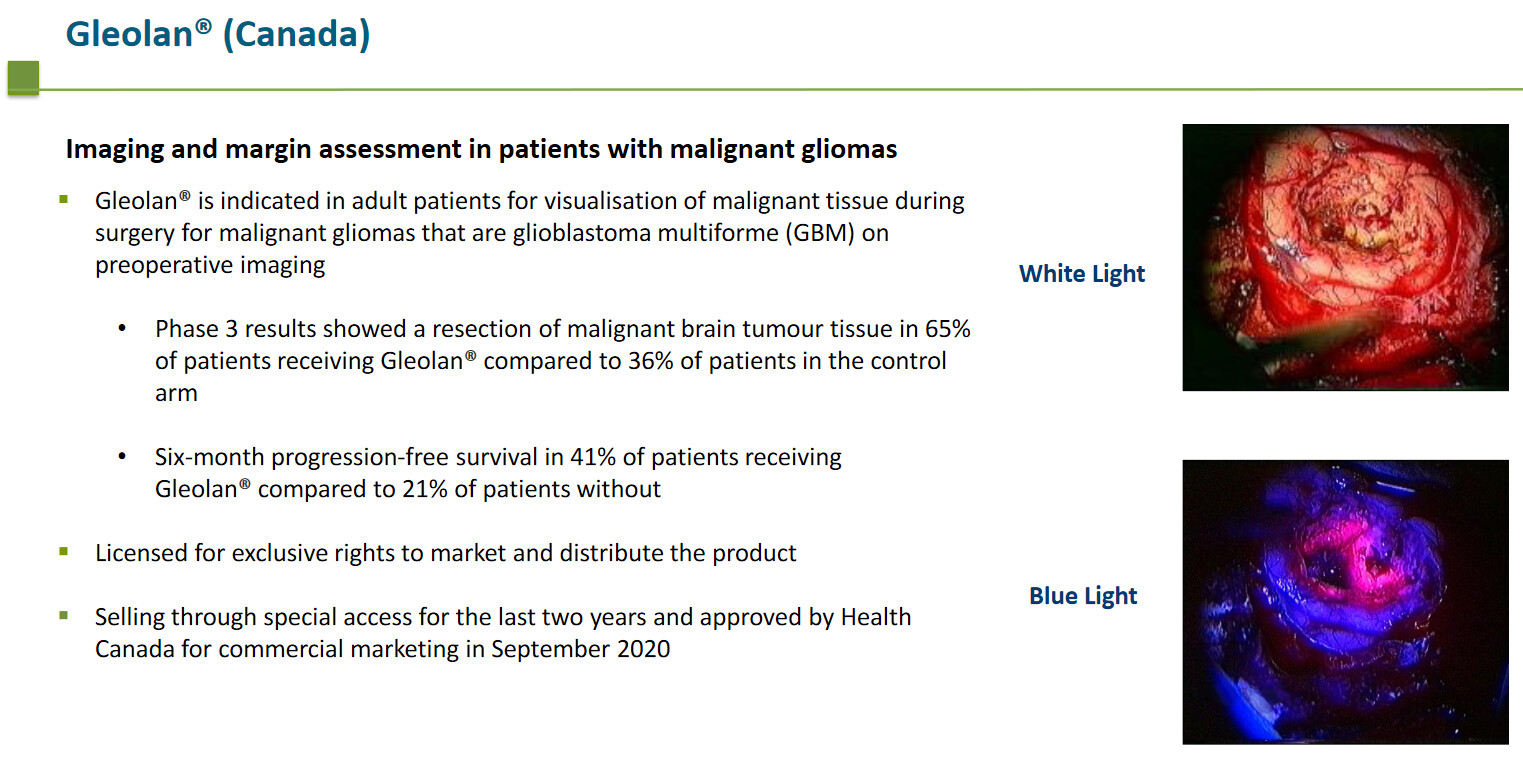 Gleolan, which “glows” in brain tumors, is the company’s newest pharmaceutical product, with regular sales having started in Canada in early February 2021.