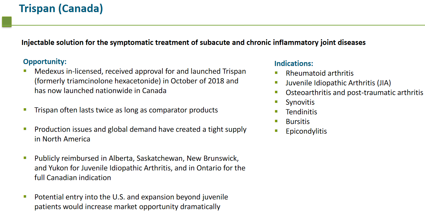 The company’s arthritis drug Trispan is expected to achieve great success, and Medexus anticipates receiving FDA approval for US sales during 2022: