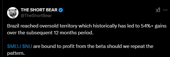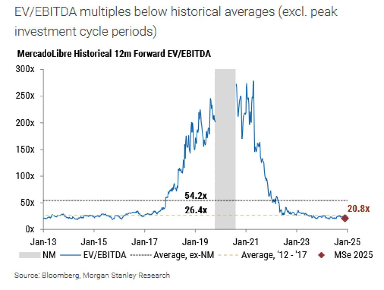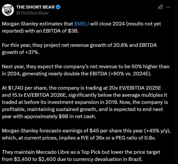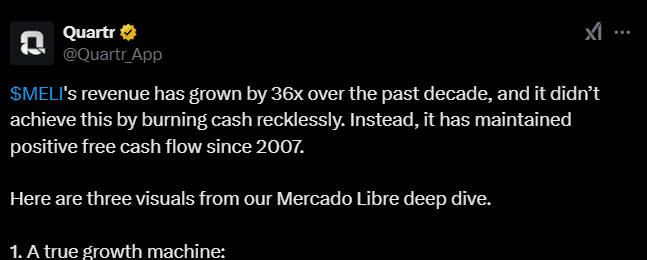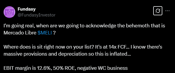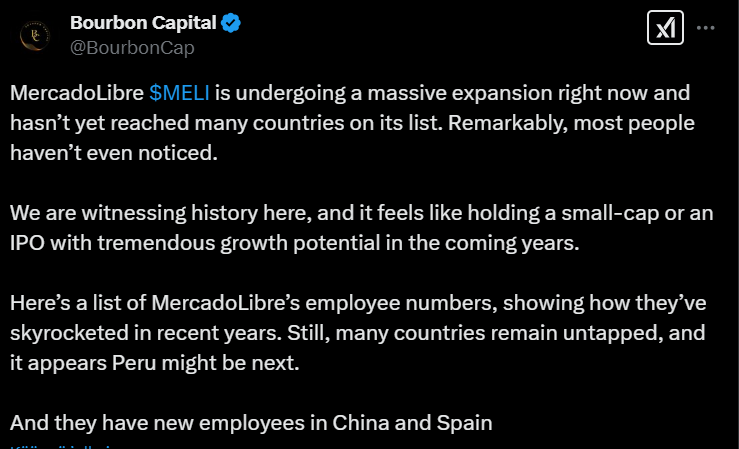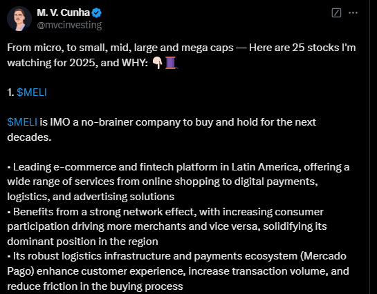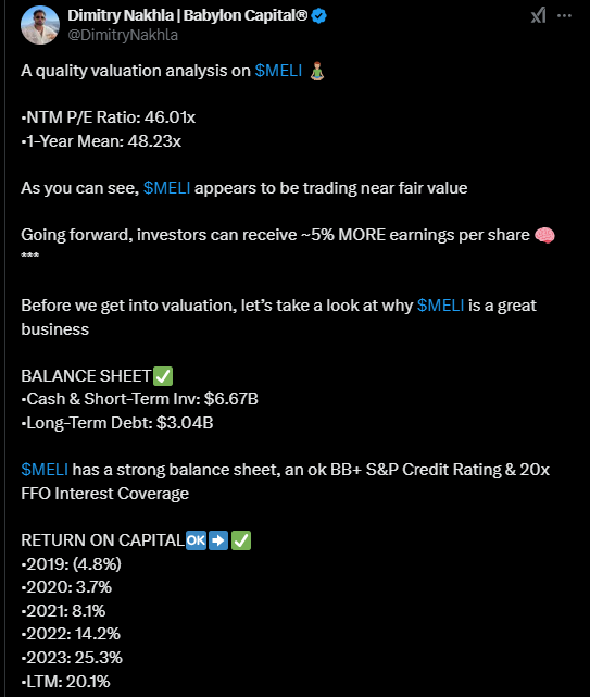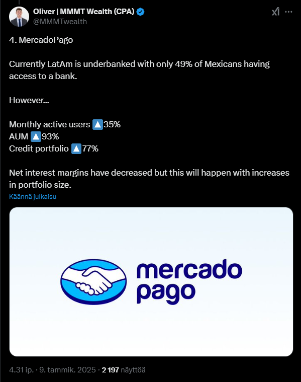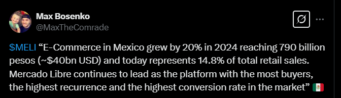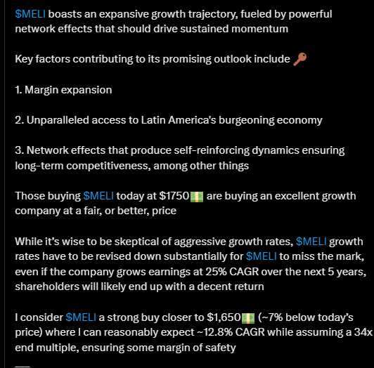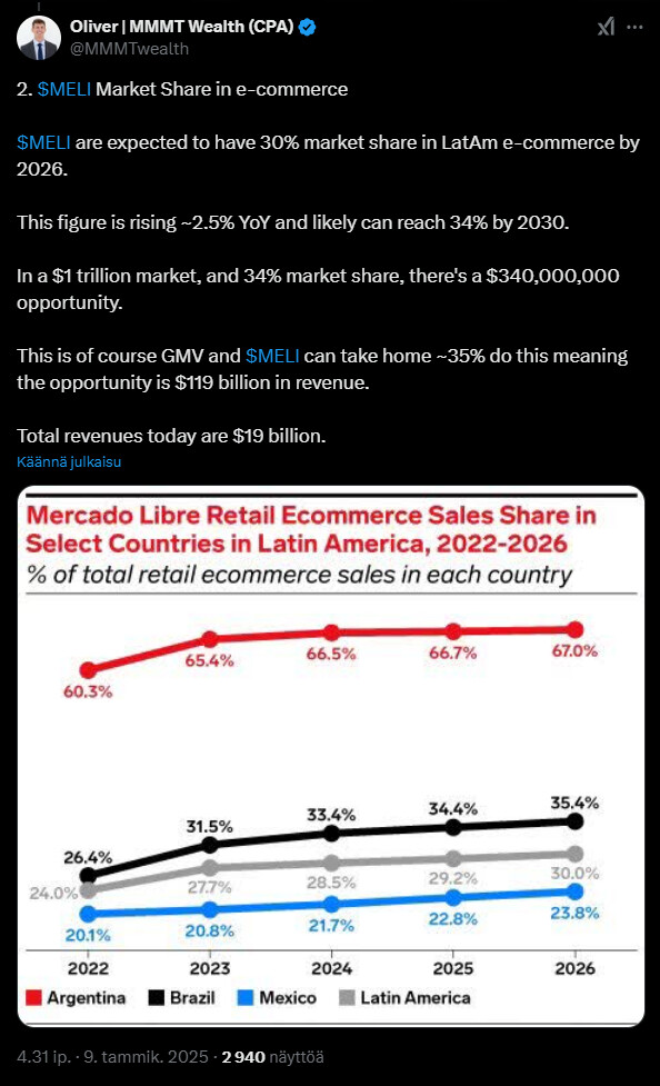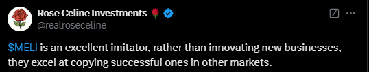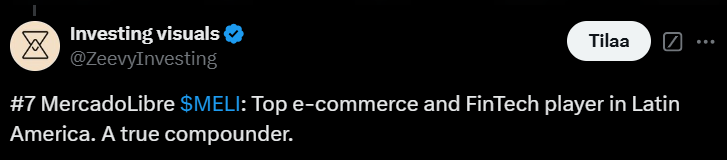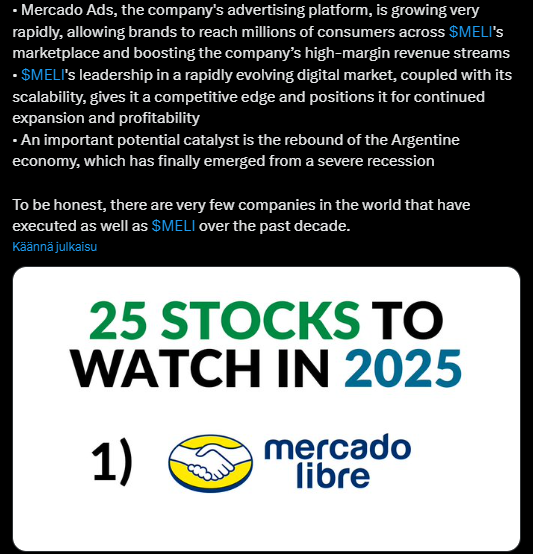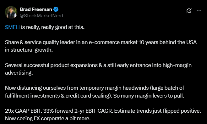 Alla olevassa tviitissä korostetaan, miten MercadoLibre hyötyy vahvoista verkostovaikutuksista, kehittyneestä logistiikasta ja kasvavasta mainosalustasta, jotka tukevat sen asemaa markkinajohtajana. Argentiinan talouden elpyminen voi toimia merkittävänä myös kasvun katalysaattorina vahvistaen yhtiön pitkän aikavälin näkymiä.