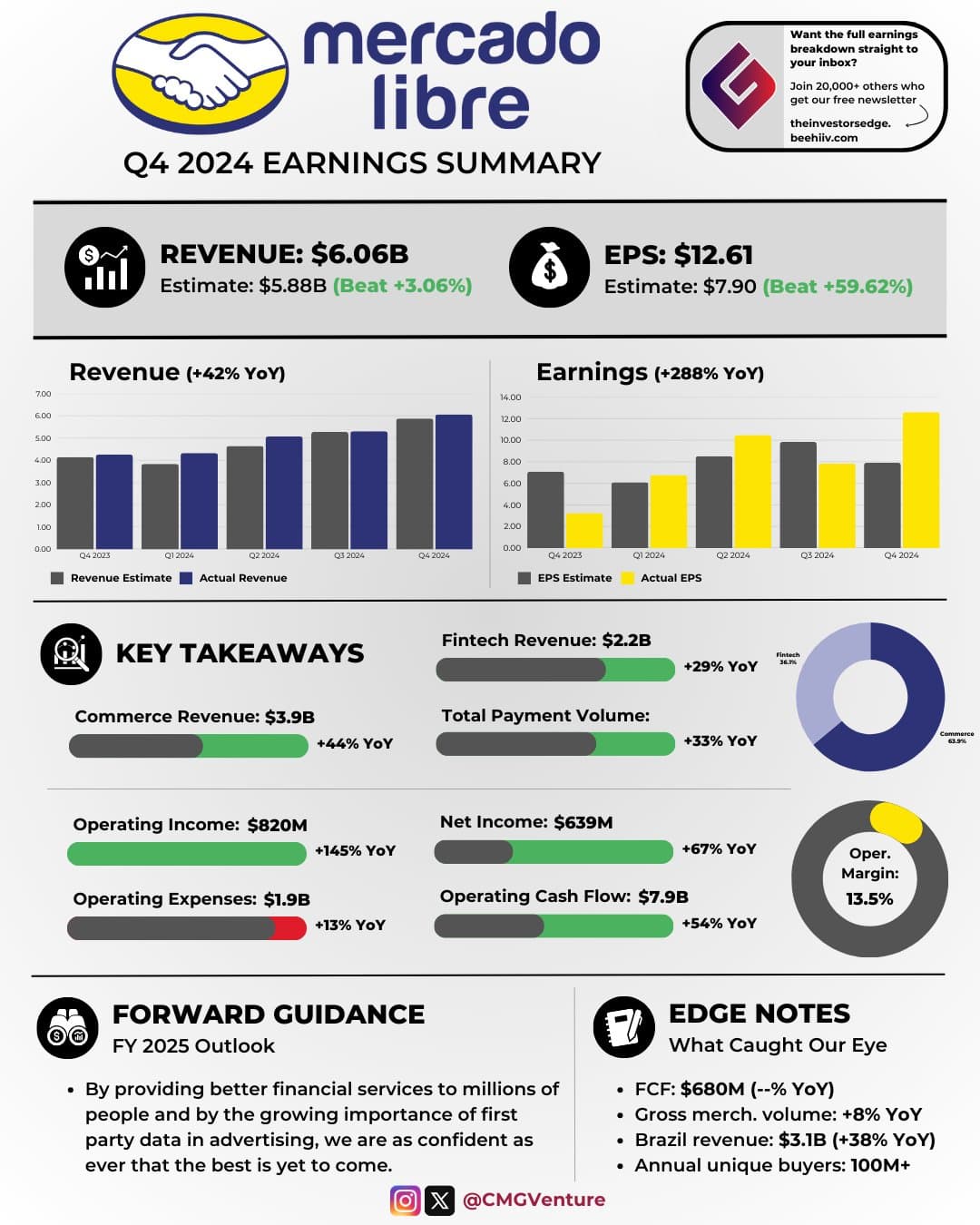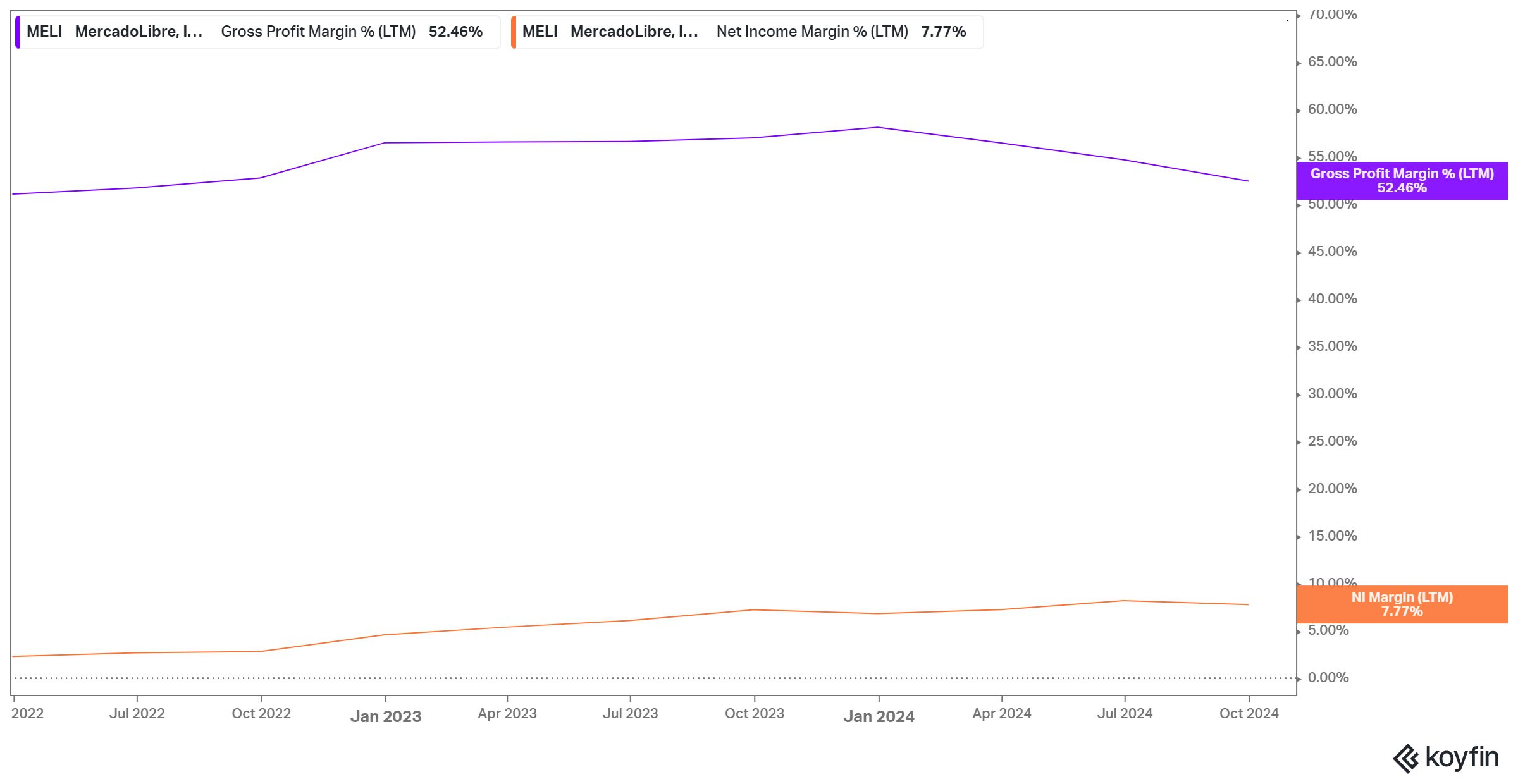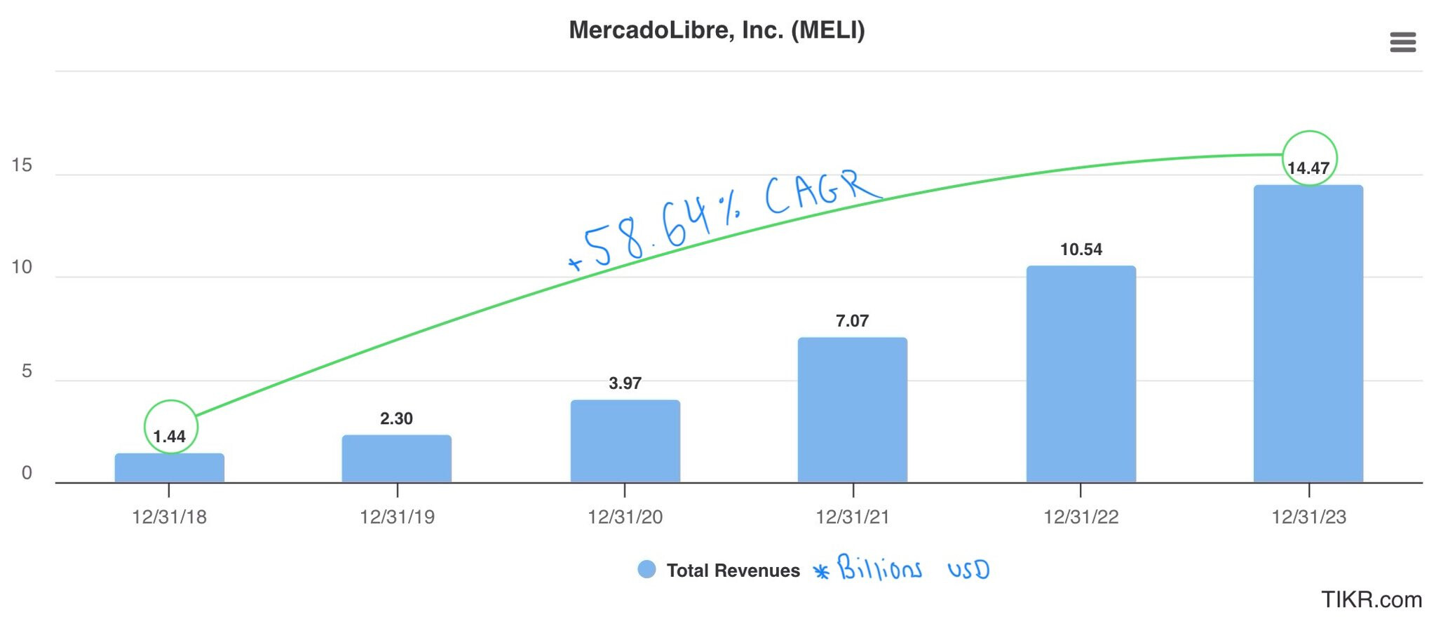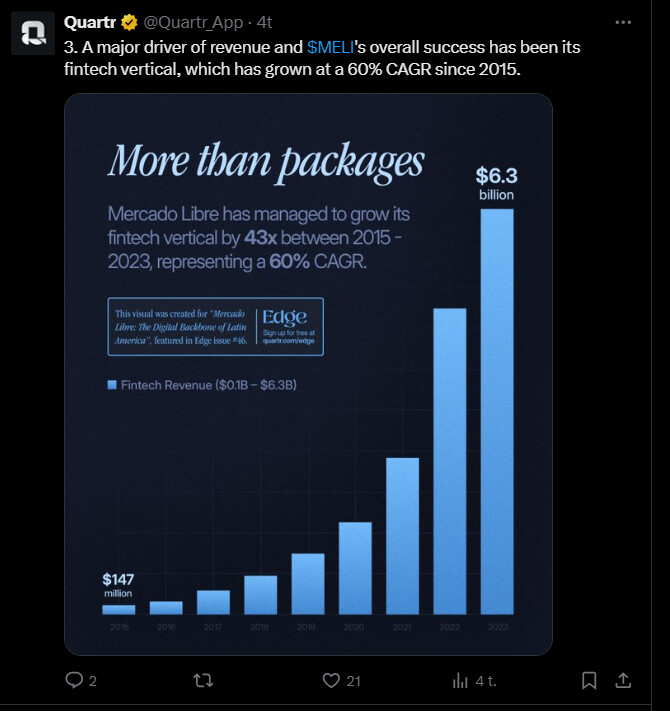 Tviitissä tuodaan ilmi, miten MELI kiinnostaa sijoittajaa vahvan kasvun ja vankan taloudellisen perustan ansiosta. Yhtiön liikevaihto on kasvanut merkittävästi vuodesta 2018 keskimääräisenä kasvuvauhtina on ollut 58,6 prosenttia, lisäksi vapaa kassavirta on noussut huikealla 203,3 % vuosittain. Yhtiön sijoitetun pääoman tuotto on parantunut huomattavasti saavuttaen viimeksi kuluneella 12 kuukaudella (LTM) 20,1 prosenttia ja oman pääoman tuoton 42,6 prosenttia.