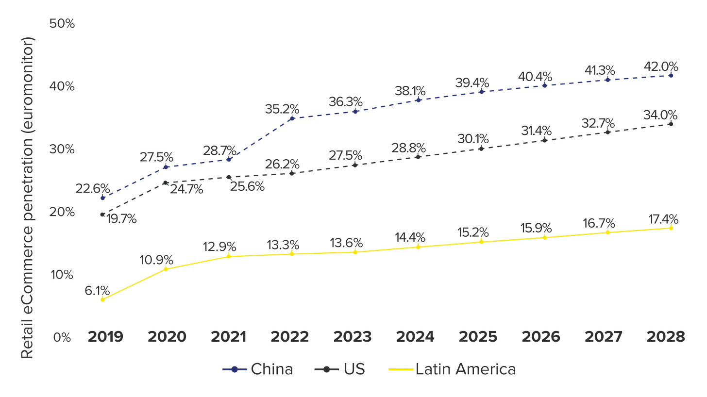 Kuten kuvasta näkee, on Lat.Am. e-commerce penetraatio aivan alussa, ja huomattavasti jäljessä jo kehittyneempiä Yhdysvaltoja ja Kiinaa. Kasvua on kuitenkin odotuksissa.