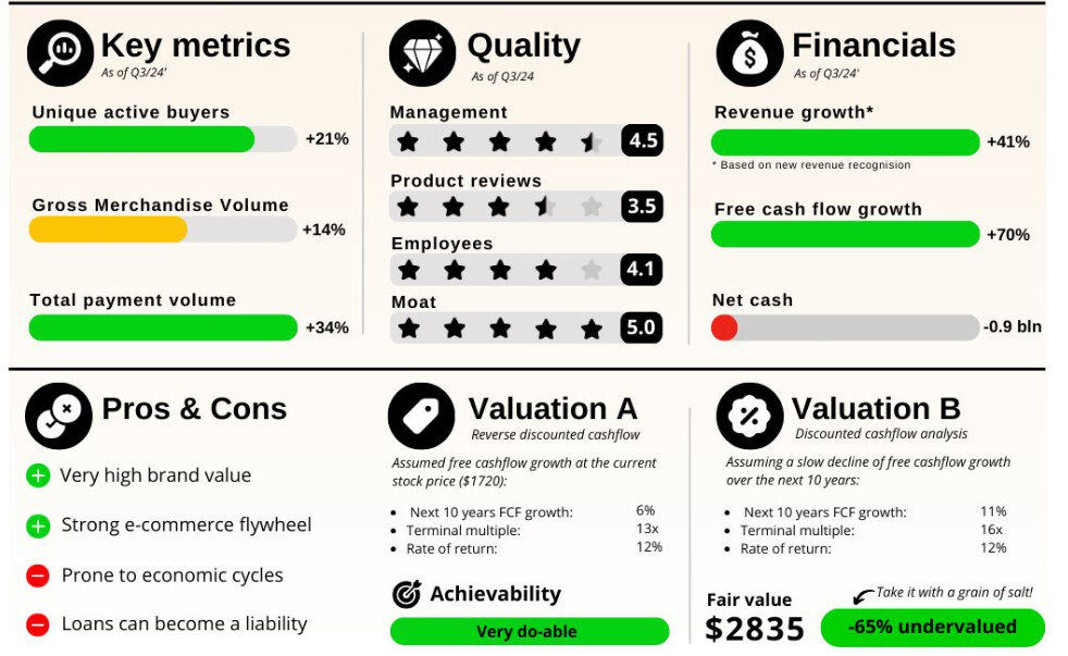 Sen markkina-asema on erittäin vahva, sillä on halussaan “alueellaan” taloudelliset ja teknologiset erityispiirteet , joka tekee kilpailijoiden pääsyn markkinoille haastavaksi. Lisäksi MELIn jatkuva laajentuminen uusille markkinoille ja fintech-palveluiden nopea kasvu lisäävät mahdollisesti sen pitkän aikavälin potentiaalia. Taloudellisten mittasuhteiden ansiosta yhtiö pystyy luonnollisesti optimoimaan kulujaan ja parantamaan kannattavuuttaan, mikä tukee kestävää kasvua. Yhtiö on hyvä apinoimaan muilta ja kehittämään itse siihen päälle