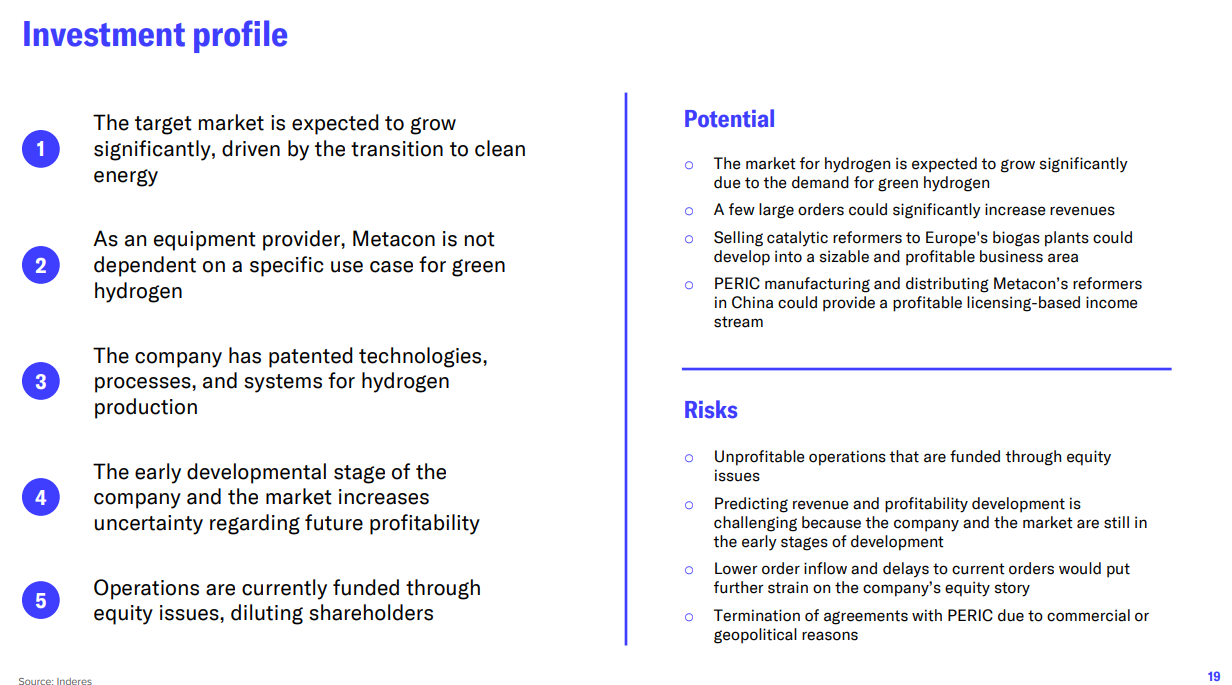 Metacon has assembled a complementary product portfolio and secured significant electrolyzer orders, which has increased revenue and brought valuable reference customers. While securing a few large orders increases the likelihood of a commercial breakthrough, it does not guarantee a steady order book. However, considering the strong long-term demand outlook for green hydrogen and Metacon’s growing market position, we see potential for continued strong revenue growth. Supported by these drivers, we assess the stock’s risk-reward ratio as attractive. We revise our target price to SEK 0.70 per share (previously SEK 0.30) and reiterate our Add recommendation.