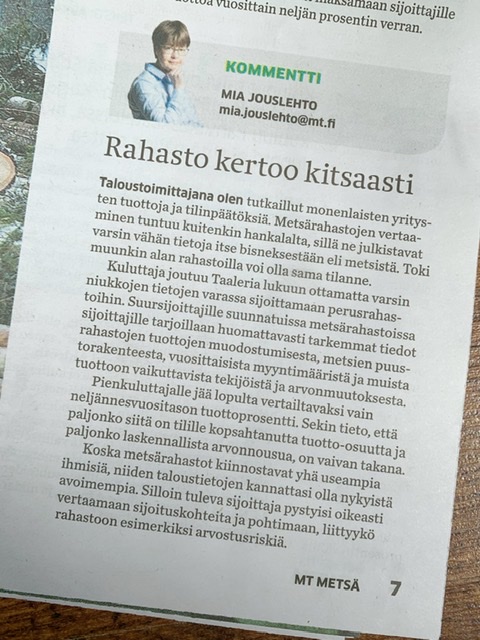 Vanhasta lehdestä (MT Metsä 2/2020) osui silmään taloustoimittajan kommentti, joka saattaa kiinnostaa ”helppoa” metsäsijoittamista pohtivia lukijoita.