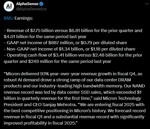 Micronin liikevaihto kasvoi vahvasti viime vuodesta, ja “AI-kysyntä” nosti mm. yhtiön datakeskusten DRAM-tuotteiden ja suuren kaistanleveyden muistin myyntiä. Myös NAND-tuotteiden myynti teki ennätyksen.
