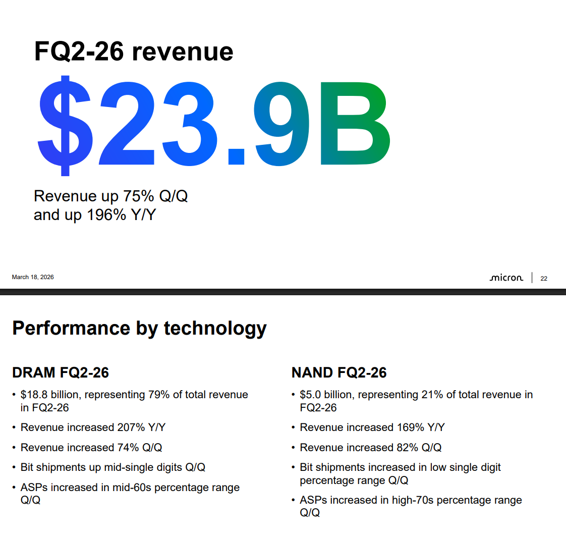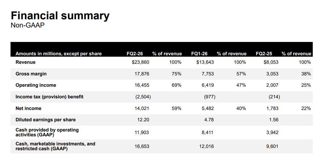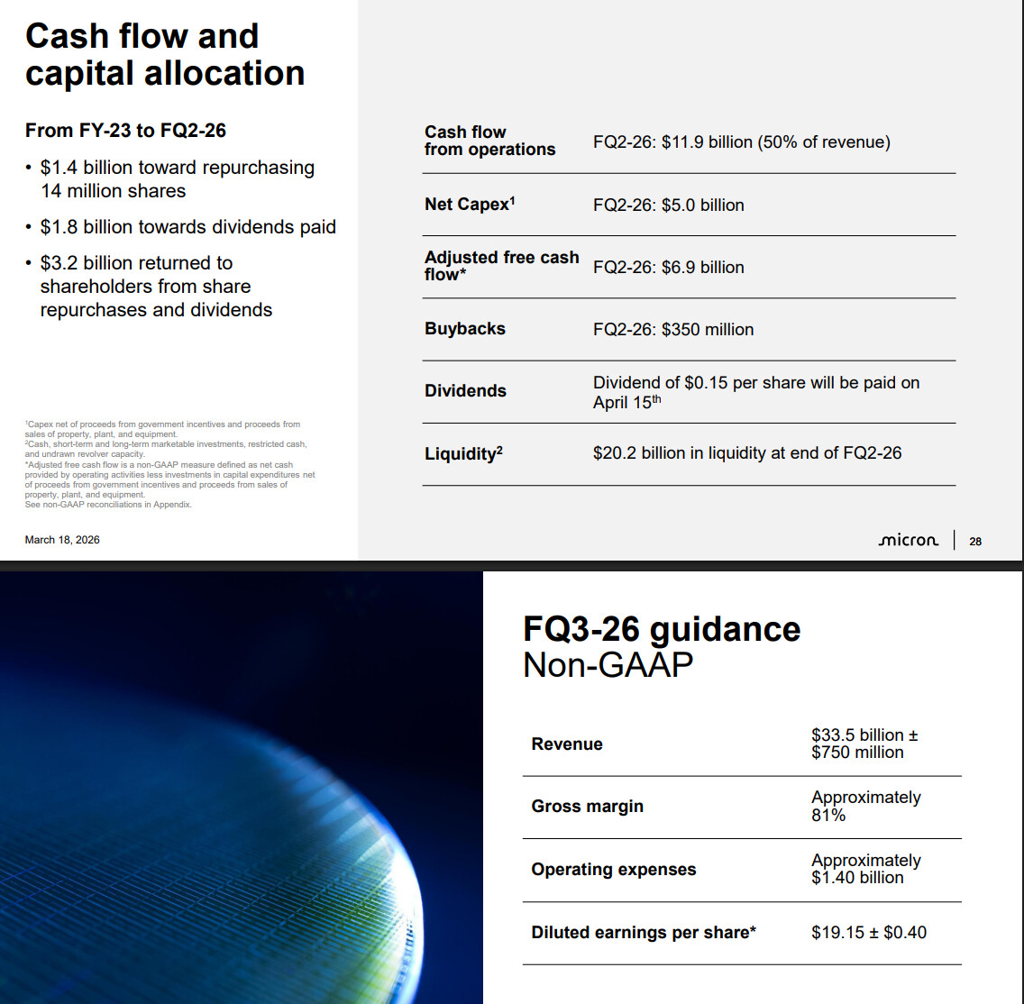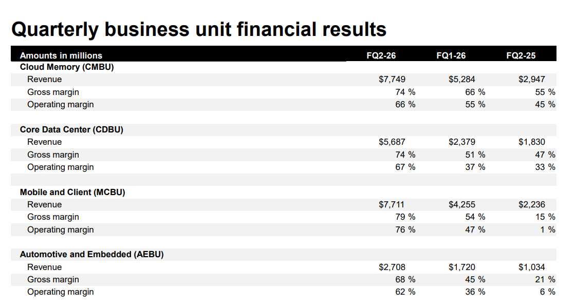Kasvu oli poikkeuksellisen vahvaa, lisäksi kannattavuus parani selvästi ja kassavirta vahvistui. Johto kuvasi kysynnän pysyvän vahvana etenkin AI:n vauhdittamana, lisäksi johto arveli, että kova meno näyttäisi jatkuvan seuraavalla neljänneksellä ja korosti tuotantoinvestointeja sekä entistä reippaampaa osingonjakoa. Myös pilvipuoli, datakeskukset, mobiilihommat ja sulautetut ratkaisut tukivat laajaa sekä reipasta menoa.