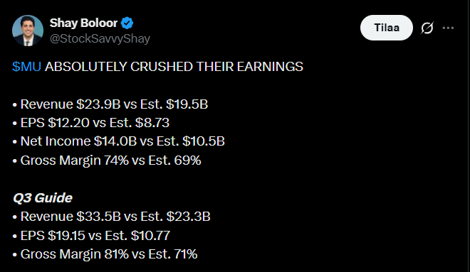 Micronin kvartaali ylitti odotukset kautta linjan, mut osake punasteli jälkimarkkinoilla, mikä viitannee siihen, että vahva tulos oli jo kuitenkin pitkälti hinnoissa.