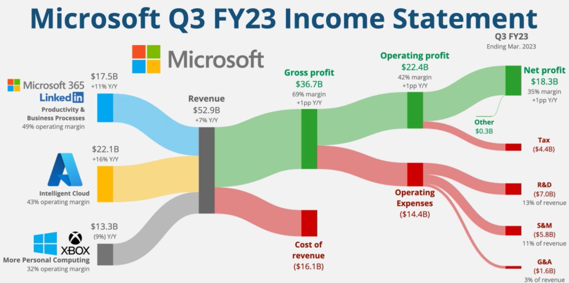 Nykyään Intelligent Cloud -segmentti onkin yhtiölle todella merkittävä tulonlähde (42% liikevaihdosta) saavuttaen +19%:n kasvun YoY viime vuonna. Segmentin sisällä etenkin Azure ja muiden pilvipalveluiden liikevaihto kasvoi +28% vuoden takaisesta.