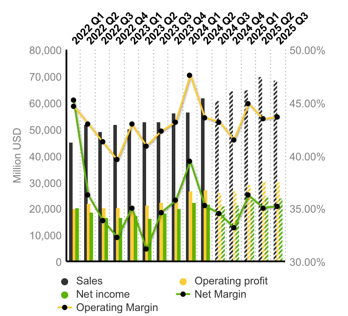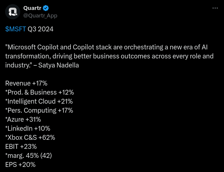 Tekoälyn hyödyntäminen tuotetarjoomassa on tuonut positiivisen vireen tulevaisuuden näkymiin, kun mm. tekoälyä hyödyntävä Azure on onnistunut voittamaan markkina-osuuksia. Yhtiöllä on myös hyvät lähtökohdat parantaa muiden työkalujensa (esim. Microsoft Copilot) tuottavuutta tekoälyn myötä.