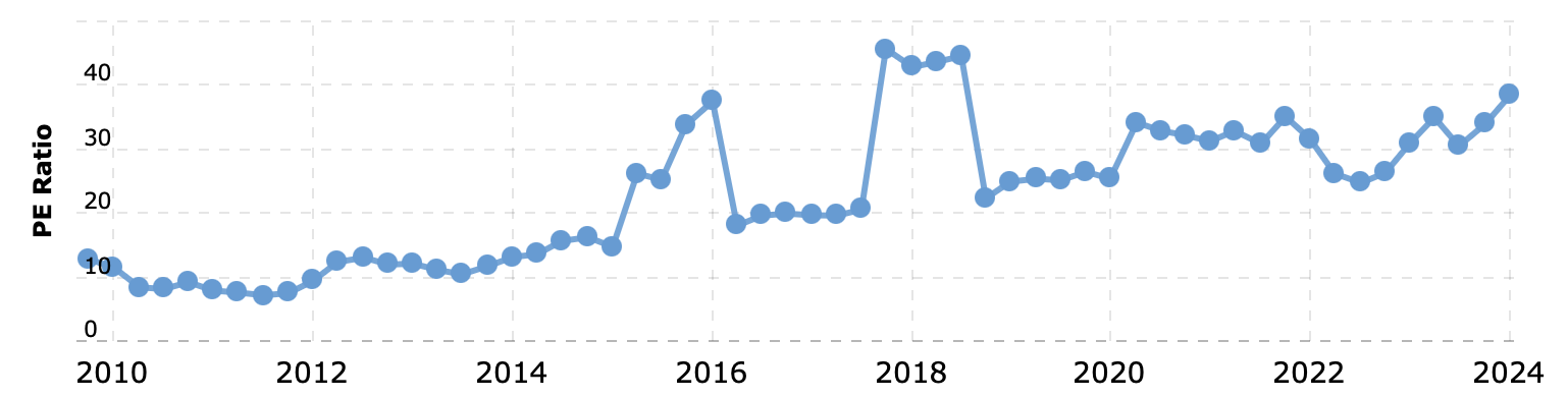 Tällä hetkellä Microsoftin osake treidaa eteenpäin katsovalla P/E:llä mitattuna 35x, joka on kova lukema, mutta niin on myös Nasdaq-indeksin P/E 31x. Kurssi pyörii kirjoitushetkellä 425$ hujakoilla ja mikäli yhtiö yltää vuonna 2026 analyytikoiden ennustamaan 15,65$ osakekohtaiseen tulokseen ja yhtiötä vielä tuolloinkin arvostettaisiin 35x P/E:llä, voisi kurssi olla tuolloin 550 $ eli 30% nykyistä korkeammalla. Osaketta on siis vaikea pitää kovinkaan edullisena ellei usko selvästi voimakkaampaan tuloskasvuun.