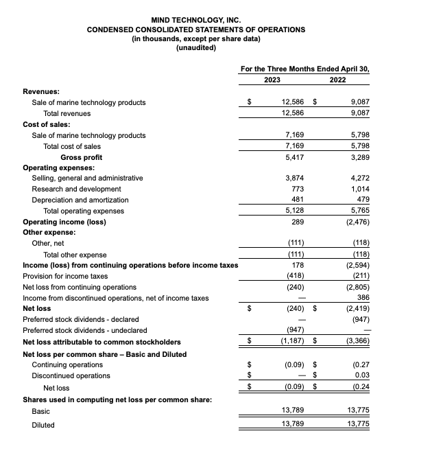 The backlog of Marine Technology Products as of April 30, 2023, was approximately $22.6 million compared to $20.7 million at January 31, 2023 and $13.4 million at April 30, 2022.