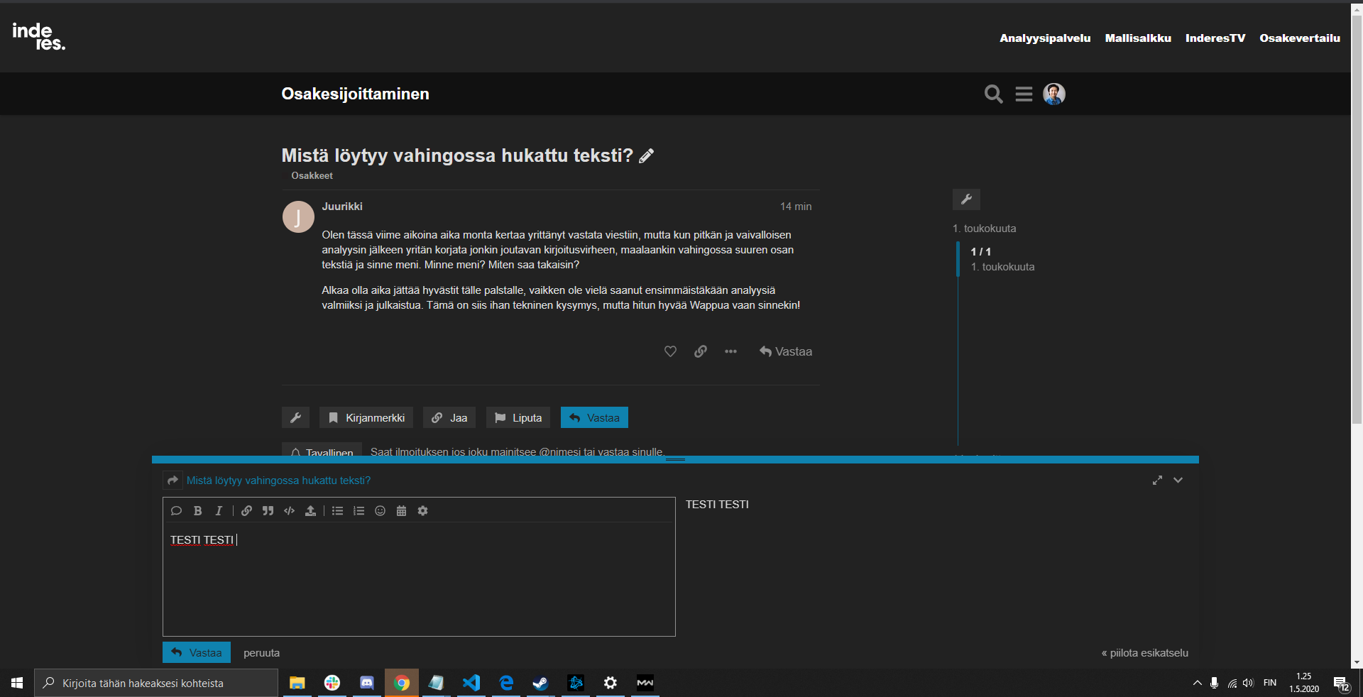 Olen tässä viime aikoina aika monta kertaa yrittänyt vastata viestiin, mutta kun pitkän ja vaivalloisen analyysin jälkeen yritän korjata jonkin joutavan kirjoitusvirheen, maalaankin vahingossa suuren osan tekstiä ja sinne meni. Minne meni? Miten saa takaisin?