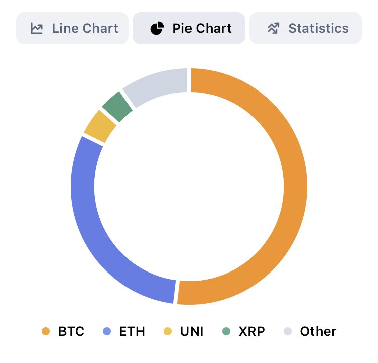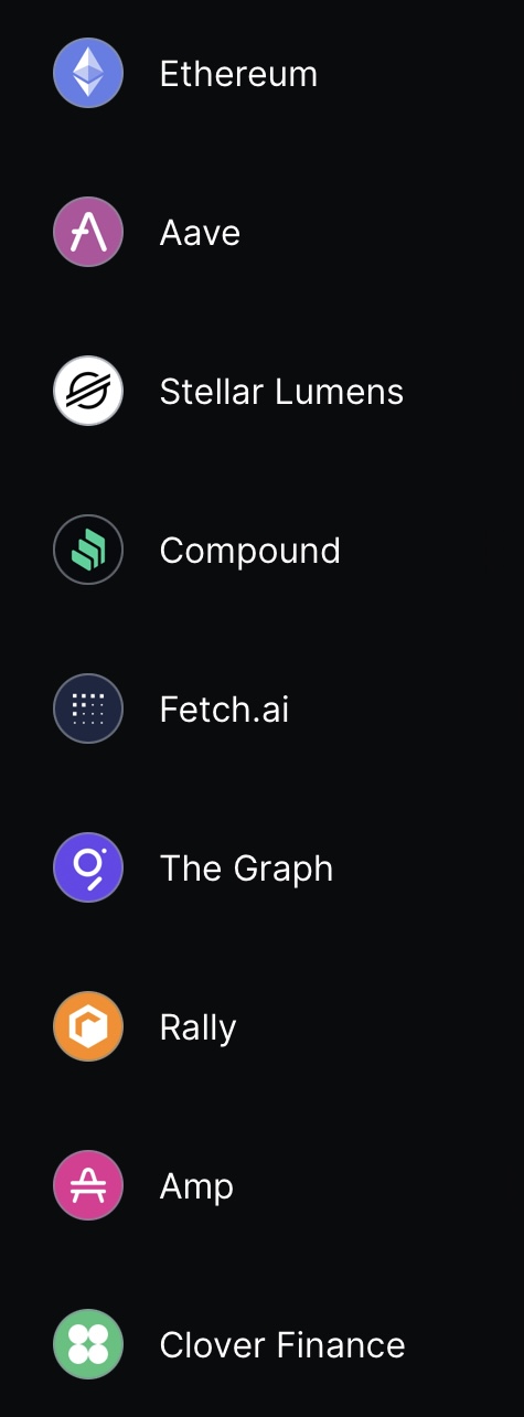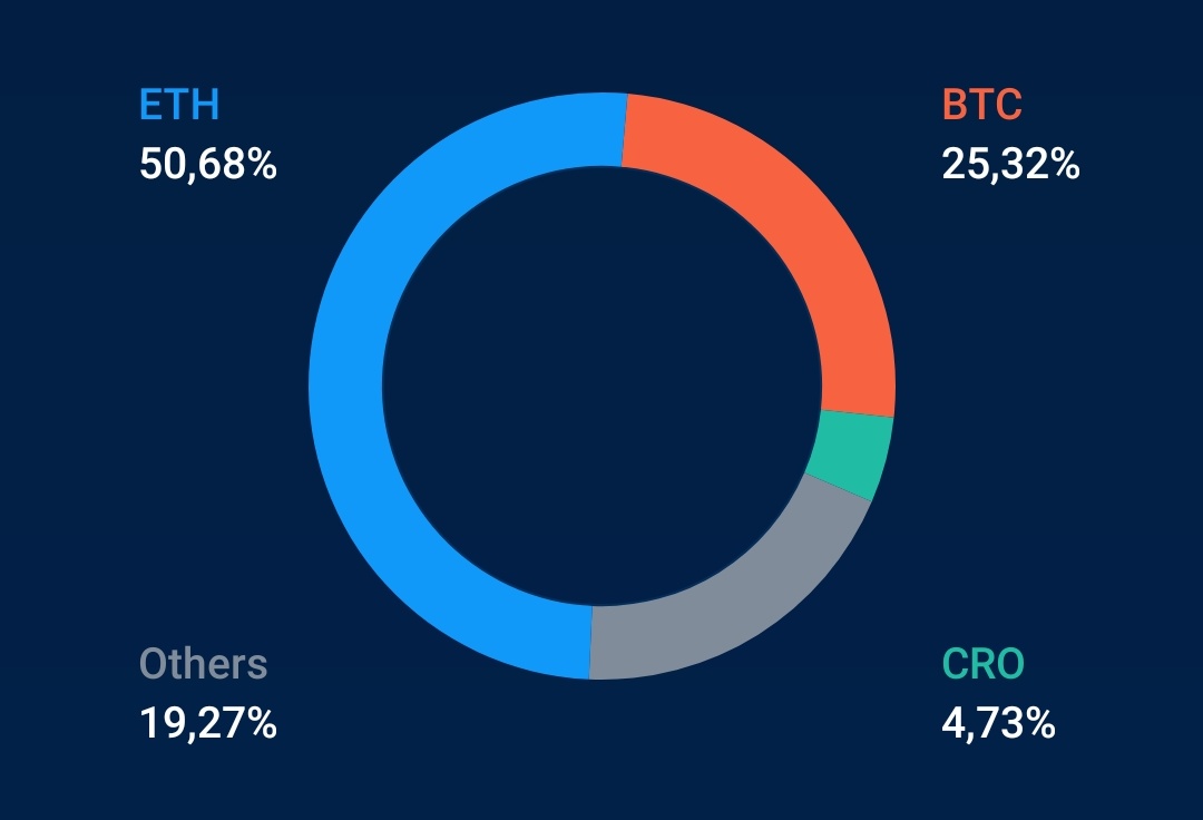 Fra største til mindste position: Ethereum, Bitcoin, Chainlink, Tezos, AAVE, Cardano, The Graph, Polkadot og Litecoin.
