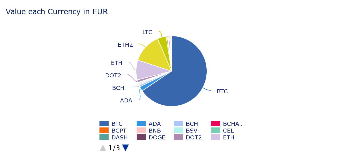 Der er meget små mængder af nogle junkcoins, der hænger fast i state wars (tilstandskrige). Billedet viser dog omtrent andelene, hvilket betyder, at de største er tydeligt BTC og ETH. Der er også ret meget LTC, dels historisk. Dette fortæller ikke noget om mængderne som sådan, men snarere om EUR-vurderingen.