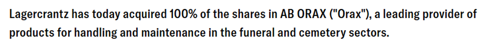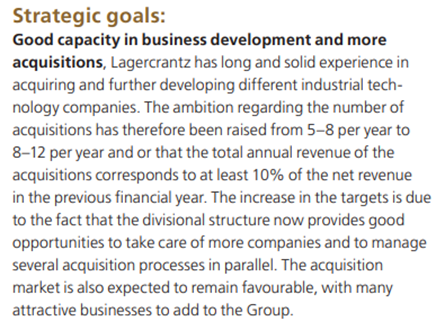 Lagercrantz: Ruotsissa on joukko erinomaisia sarjayhdistelijöitä ja Lagercrantz kuuluu tähän kalliiseen ja arvostettuun ryhmään. Tulli hermoilussa yhtiötä sai hieman halvemmalla, joten aloitin ostot. Lagercrantz on kiihdyttämässä yritysosto tahtiaan, koska divisioona järjestely mahdollistaa useamman yhtiön D&D ja integroimisen. Yhtiö tekee myös jatkuvaa työtä bruttokatteen parantamiseksi ja orgaaninen kasvu on lopulta taas heräilemässä.
