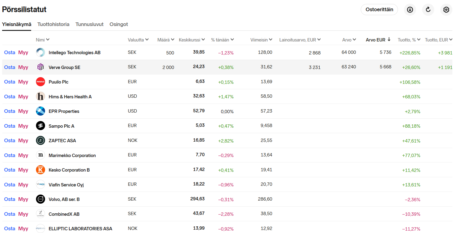 Tuoreet rivit Intellego Tech ja Verve +30% ja +20% 8 ja 6 päivässä. Harmi, että positiot ovat noin pienet. En ymmärrä Intellegon toiminnasta tarpeeksi, jotta uskaltaisin lisätä sitä tähän hätään, mutta luvut ovat huikeat. Verveä lisään mahdollisuuksien mukaan.