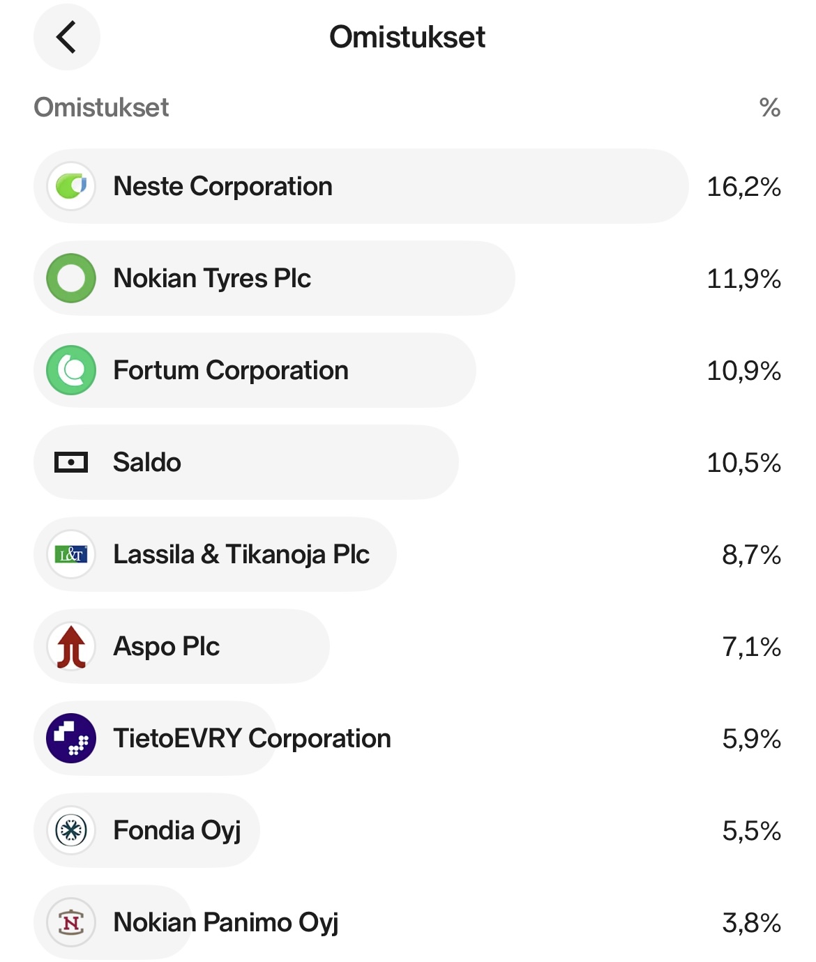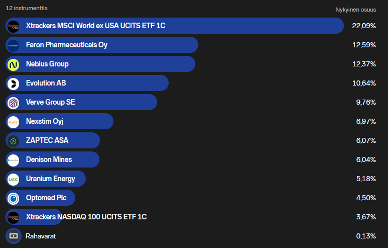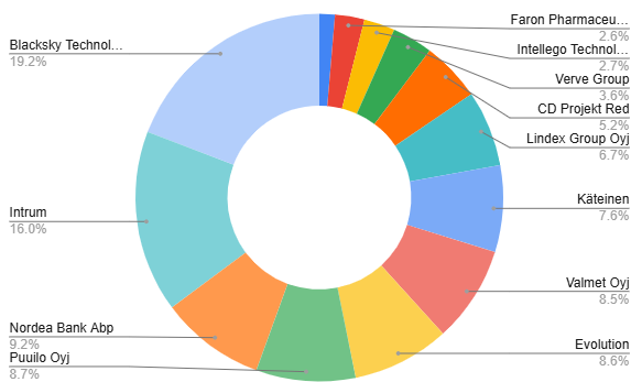 1. Eri ETF:ät - 20.1% - Kuukausisäästöt menevät ETF-iin ainakin toistaiseksi. 2. Kesko, 15.4% - Näistä kaikki saatu lahjaksi, A ja B -sarjaa sekaisin. Tätä isommaksi en painoa varmaankaan haluaisi, vaikka onkin kokonaisvaltaisesti melko hyvä fiilis Keskon toiminnasta. En ole siis itse ostanut lisää. 3. Konecranes, 9.0 % - Nämäkin kaikki saatu lahjaksi. 4. Sampo, 7.9% - Näistä (hyvin pieni) osa saatu lahjana. Itse olen If:in asiakkaana ollut aina tyytyväinen, toiminta on mielestäni rullannut hyvin ja vakuutusbisnes “pitäisi” olla matemaattisesti rahaa tuottavaa. Sammon varmasti kaikki tuntevat, joten turha sen enempää selitellä 5. Nordea, 7.7% - Suomen paras pankkiosake. Menee varmaan samaan kategoriaan Sammon kanssa siinä, ettei tarvitse selitellä 6. Neste, 6.9% - Osa saatu lahjaksi, mutta tankkasin itse ihan hyvän määrän itse alle kymmenestä eurosta. Vaikka ilmastopolitiikka globaalisti onkin hyvin vaihtelevaa, niin uskon että Nesteen tuotteille tulee olemaan tarpeeksi kysyntää tulevaisuudessa eikä kurssin kuulu olla ihan niin matalalla kun missä se kävi. 7. Relais, 6.7% - Ala jonka kysyntä ei ainakaan vähene, ja osake jota jostain syystä moni ei vaikuta tuntevan. Vahvaa toimintaa jo jonkin aikaa, ja mielestäni alhainen arvostus. Jännittää nähdä, miten tuleva TJ-vaihto toimii, ja tuleeko sen jälkeen muutoksia. Ei ole jännittänyt lisäillä tätä. 8. Mandatum, 5.8% - Ostin splitin aikaan, mutta rehellisesti en ihan ymmärrä yritysta tarpeeksi hyvin. Ehkä pitää käyttää enemmän aikaa tutustumiseen. Täten minun osalta yleisesti “turvallisena” nähty lottolappu. Ainakin sitä kuuluisaa osinkoa tulossa, vaikken osinkopuolueeseen halua liittyä. 9. Terveystalo, 4.7% - Tätä hankin edellisten vaalien aikaan, ja olen harkinnut lisäämistä. En kuitenkaan vielä ole kerennyt päivittää omaa tietämystäni sote-politiikan viimeisimmistä puheenaiheista. Terveydenhuollolle on kuitenkin tässä maassa kysyntää, enkä usko nykyiseen alue-sote-malliin pitkällä tähtäimellä ellei muutoksia tule. 10. Valmet, 4.4% - Nämä saatu lahjaksi. Perusvarmaa suorittamista ollut sinä aikana, kun olen omistajana ollut. 11. Revenio, 4.3% - Osa saatu lahjaksi, mutta ostin lisää itse. Itse olen päässyt Revenion laitteiden helppokäyttöisyyttä todistamaan useaan kertaan. 12. Admicom, 3.1% - Ostin tätä joskus kauemman aikaa sitten, silloin kun sijoituspäätökseni olivat paljon huonommin perusteltuja. Lähtee varmaankin myyntiin pian. En tunne toimialaa kovin hyvin eikä minulle kantautuneet kokemukset softasta ole sellaisia että niiden varaan voisin pitkällä aikavälillä nojata. Muutenkin pitäisi karsia rivejä. 13. Nightingale Health, 3.1% - Kävin itse työterveyden kautta Nighingalen testeissä, ja tykkäsin saamistani raporteista. Joitain diilejä julkaistu viime aikoina, toivottavasti tulisi lisää. Harkitsen lisäämistä.