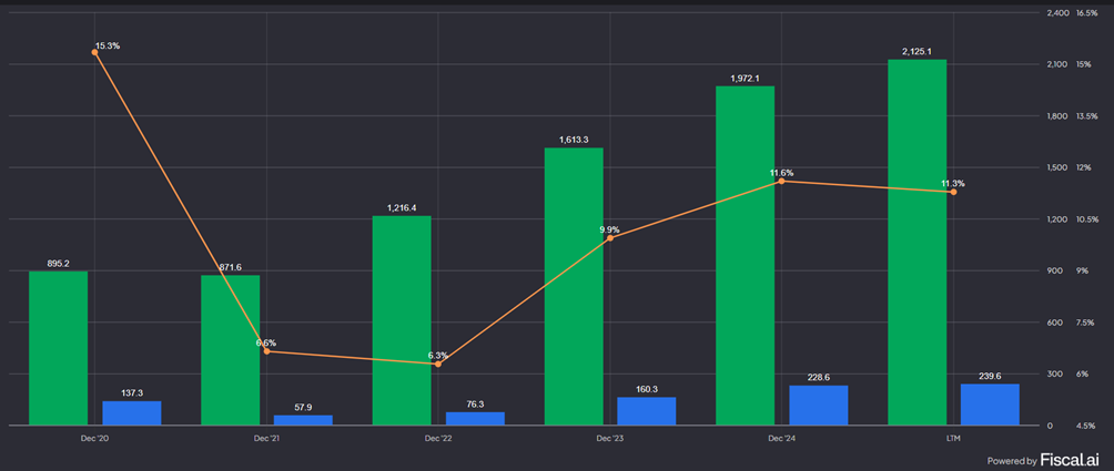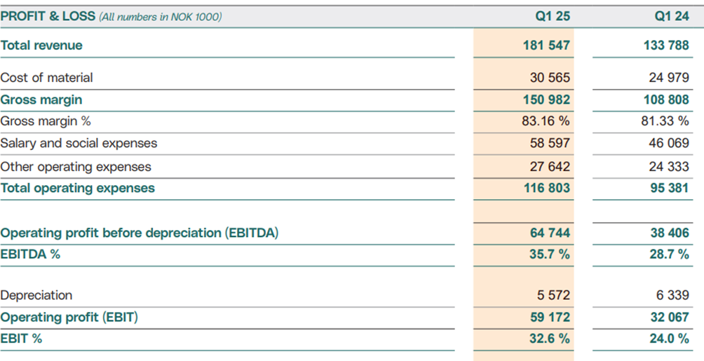 Q1 liikevaihto kasvoi peräti 36% ja EBIT 38%. Ilman kertaluonteisia kustannuksia EBIT marginaali olisi parantunut 7,6% → 11,3% verrattuna vuodentakaiseen ensimmäiseen kvartaaliin. Odotan, että EBIT liikkuisi 15% tasolle pitkällä ajalla.