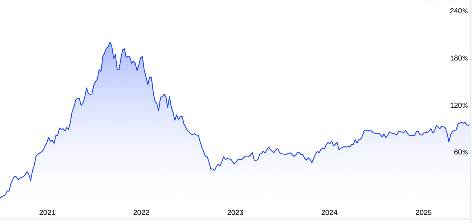 Tällä kertaa salkkukatsaus venähti hieman loman vuoksi. H1 2025 on ollut erittäin suotuisa: aiemmin myydyn Ethereumin lisäksi Rolls-Roycesta tuli sijoitusurani toinen tenbaggeri – tuotto nyt +958 %. Kurssikäyrästä on tullut otettua jo useampi kuvakaappaus, joten nyt voisi olla hyvä hetki keventää positiota. Kysymys kuuluukin: mihin hajauttaisin tästä saadut tuotot?