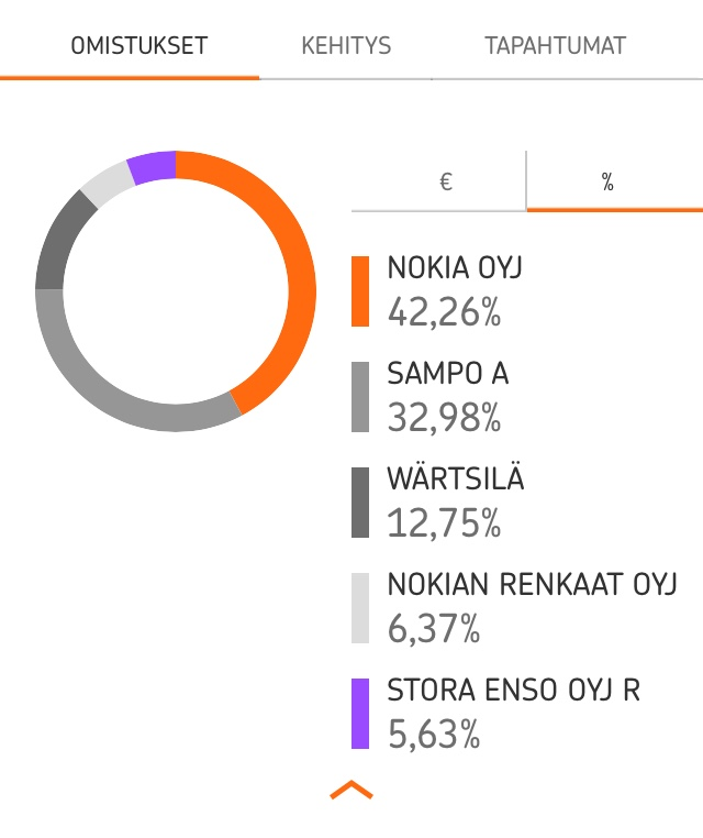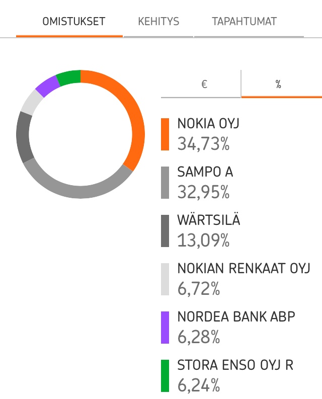 Nyt Outokummun myynnin jälkeen ja siitä seuranneen Sammon oston jälkeen omistusosuudet salkussa vähän muuttuneet, tässä omistukset tällä hetkellä