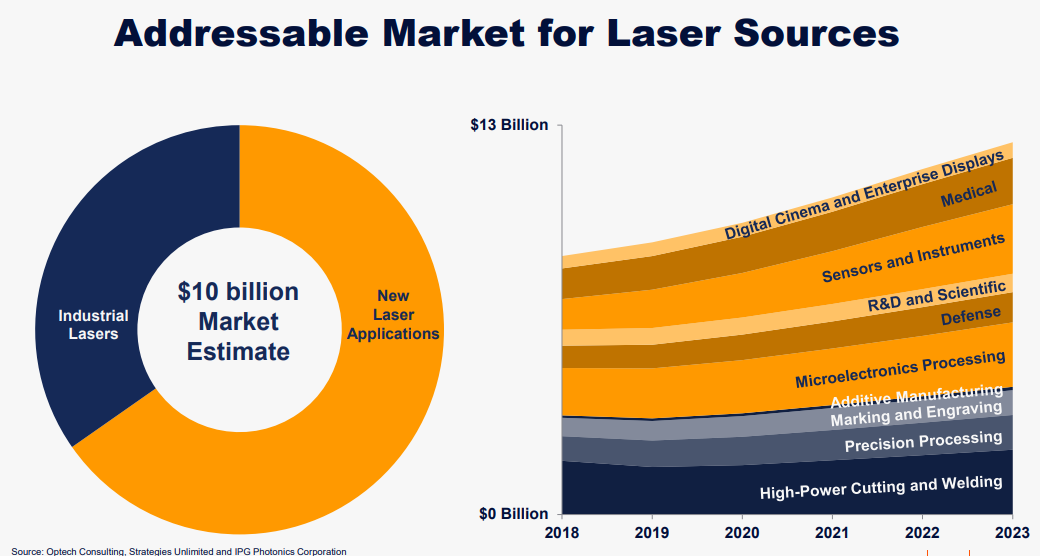 Ainakin tämän alan yhden suurimman tai suurimman toimijan IPG Photonics Corporation (NASDAQ: IPGP) hyvistä materiaaleista löytyi seuraava dia markkinan koosta.