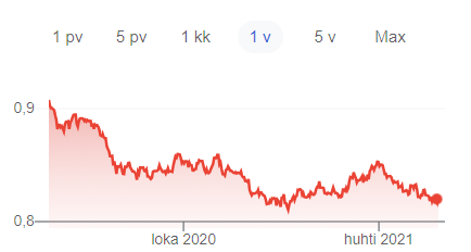 Viime viikkoina Yhdysvaltain dollari on heikentynyt jonkin verran suhteessa euroon. Itselläni on sijoituksista iso osa dollarimääräisiä joten tämä on vaikuttanut negatiivisesti salkun kehitykseen. Saa nähdä miten kehitys jatkuu, vielä jonkin verran heikentymistä on ennustettu.