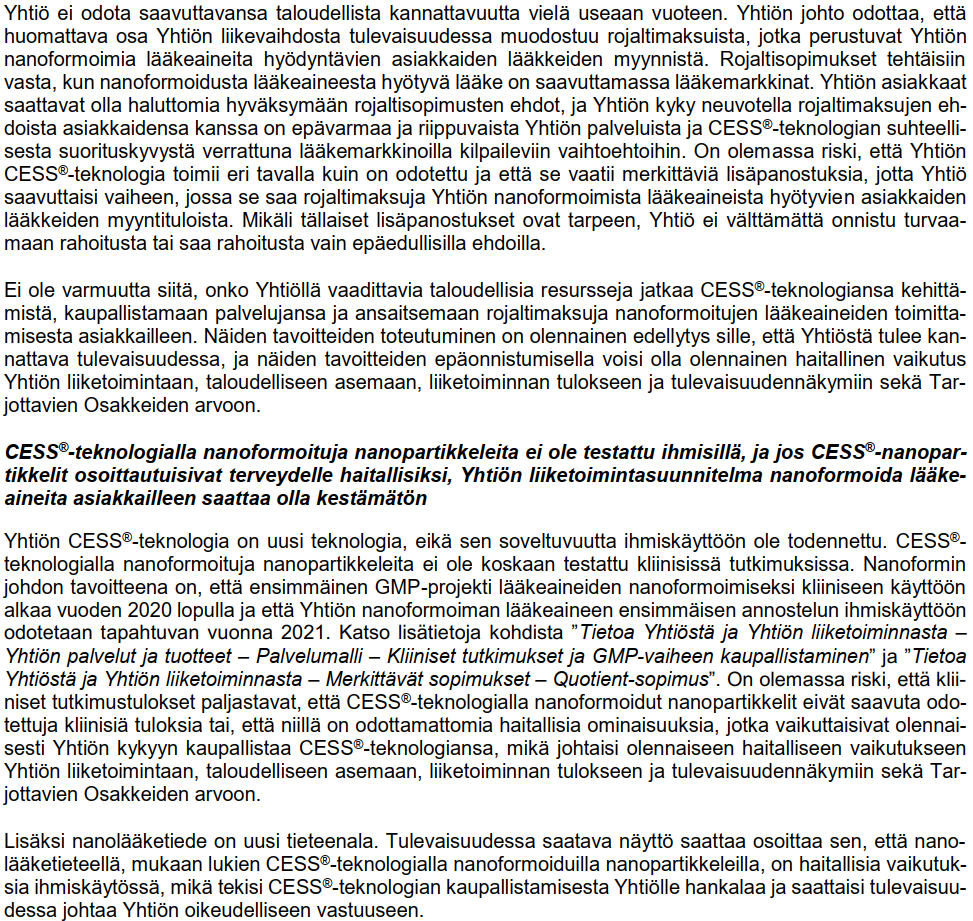 Oheinen kohta listaolleottoesitteestä kertoo miksi en näillä tiedoilla osallistu antiin. Yhtiön käyttämä teknologia ei välttämättä toimi ja vaikka toimisi niin rahaa ei ole tulossa vuosiin. Pitänee harkita uudestaan kun pari ensimmäistä lisäantia on tehty, yrityksen tuote on todettu toimivaksi ja jotain rahaakin on näköpiirissä :sleeping: