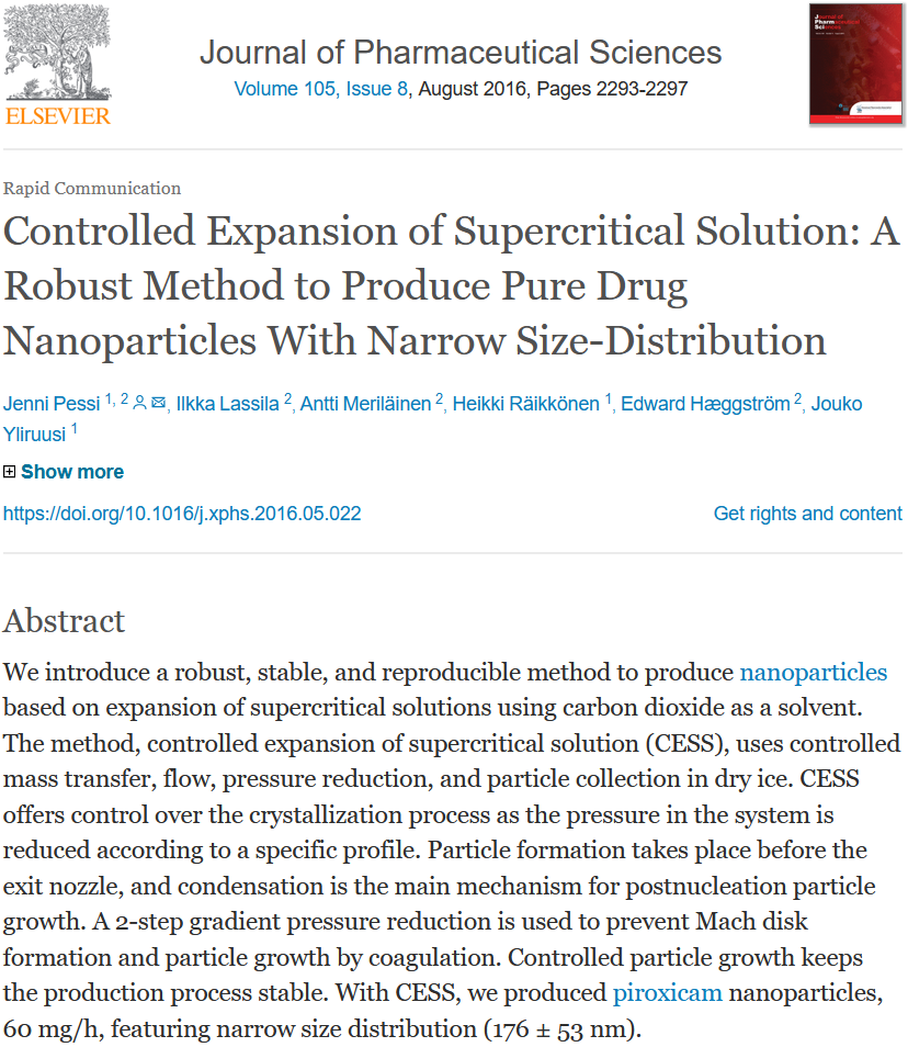 Google Scholarista löytyi vuodelta 2016 artikkeli CESS teknologiasta hakusanalla “Controlled Expansion of Supercritical Solutions”. Löytyy kanssa paljon tavaraa kun etsii Häeggströmin ja Yliruusin nimillä. Pahempi sanoa kuinka paljon tuloksista on kuitenkaan Nanoformille oleellisia.