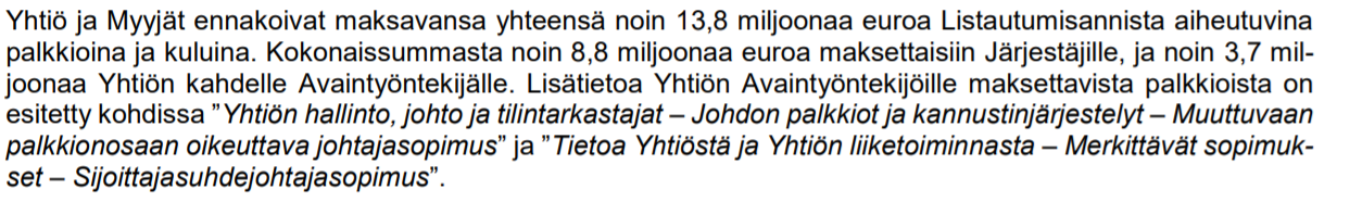 Yhtiö ja Myyjät ennakoivat maksavansa yhteensä noin 13,8 miljoonaa euroa Listautumisannista aiheutuvina palkkioina ja kuluina. Kokonaissummasta noin 8,8 miljoonaa euroa maksettaisiin Järjestäjille, ja noin 3,7 miljoonaa Yhtiön kahdelle Avaintyöntekijälle.