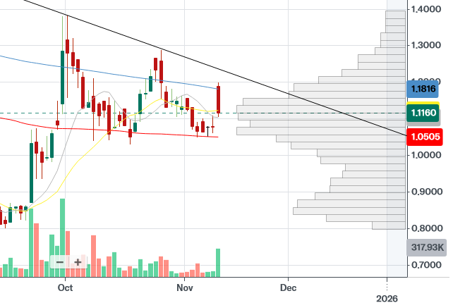 Kursen har också stigit ganska mycket nyligen. Idag verkar toppen ha träffat trendlinjen som går genom toppen på 3,5€ i början av 2024 och toppen på 1,38€ i början av oktober, och botten verkar ha träffat 20-dagars MA. Den övre linjen borde nog brytas igenom innan vi kan stiga ordentligt.