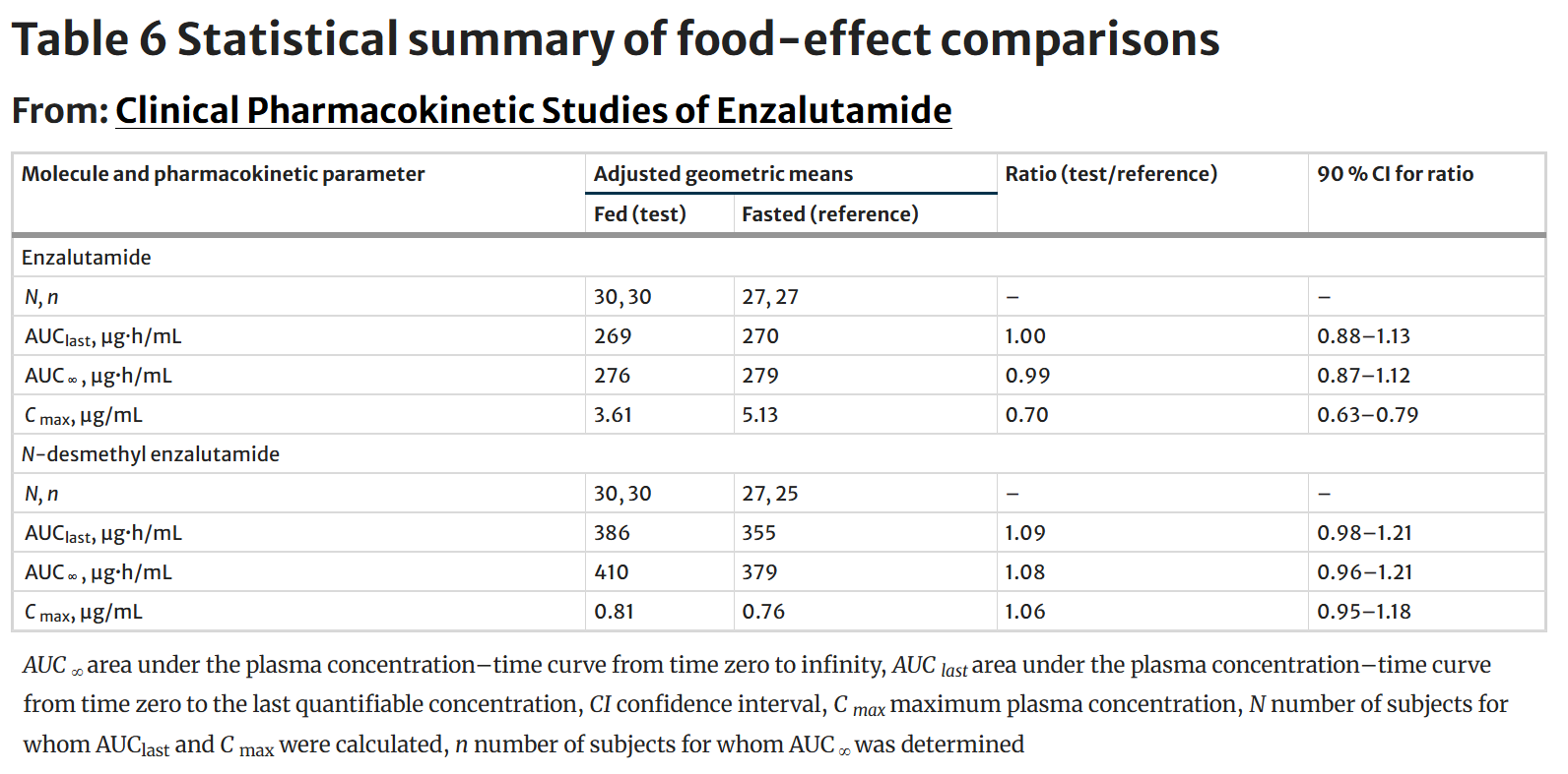 Jaahas, tämmöinen himmeli nyt sitten vastassa. Jääkö se nyt roikkumaan tuon Cmaxin vuoksi? Kaivelin enzalutamidin food effectin dataa täältä. Tässä Cmax laskee fasted ja fed tilojen välillä alle tuon 0.80-1.25 välin.
