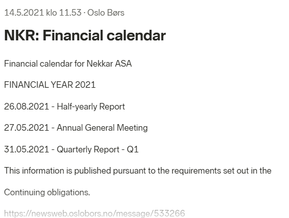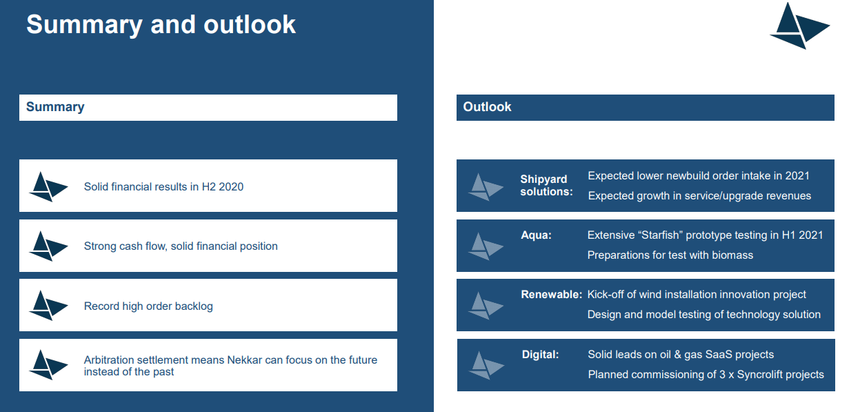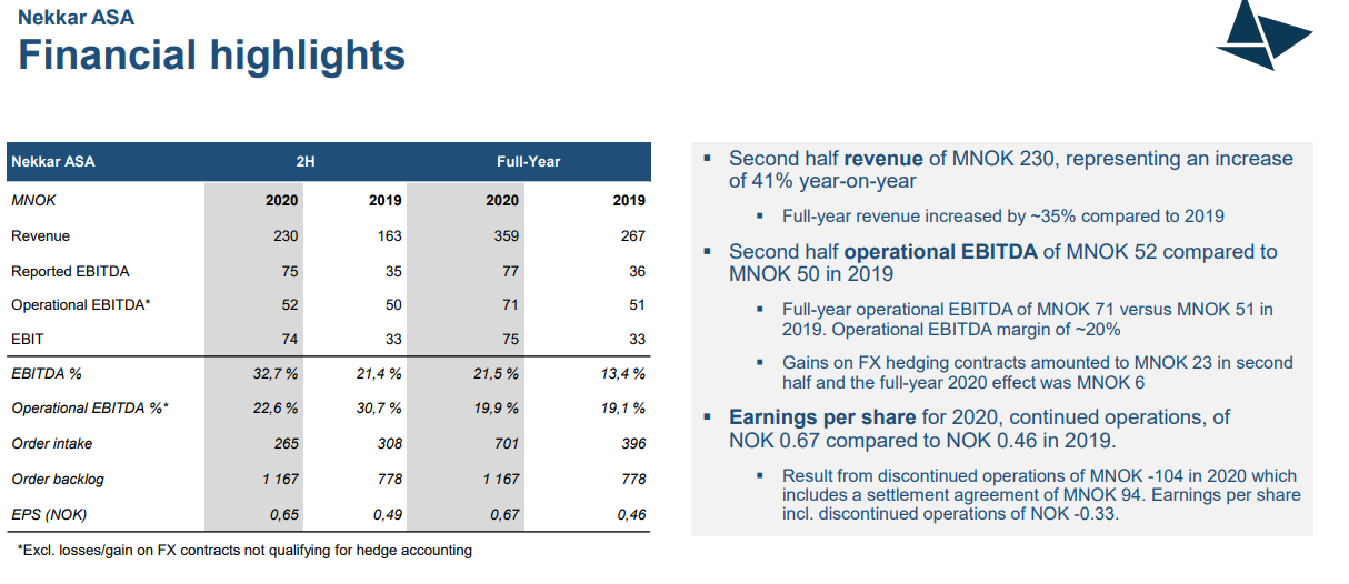Nykyinen yhtiö syntyi Macgregorin jäänteistä, sen jälkeen kun Cargotec osti sen vuonna 2019. Vanhan liiketoiminnan myynnistä saadut varat jaettiin osinkona silloisille osakkeenomistajille vuonna 2019, mikä selittää mielenkiintoisen kurssikehityksen. Kauppa jätti kuitenkin varjon liiketoimintaa jatkaneen Nekkarin ylle, kun Cargotec haastoi kauppahinnan epäselvyyksien vuoksi ja vaati 240 miljoonan norjan kruunun korjausta kauppahintaan. Tämän vuoden tammikuussa yhtiöt kuitenkin pääsivät sopuun ja Nekkar joutui maksamaan vain 94 miljoonaa kruunua, johon markkina reagoi 20 % kurssinousulla.